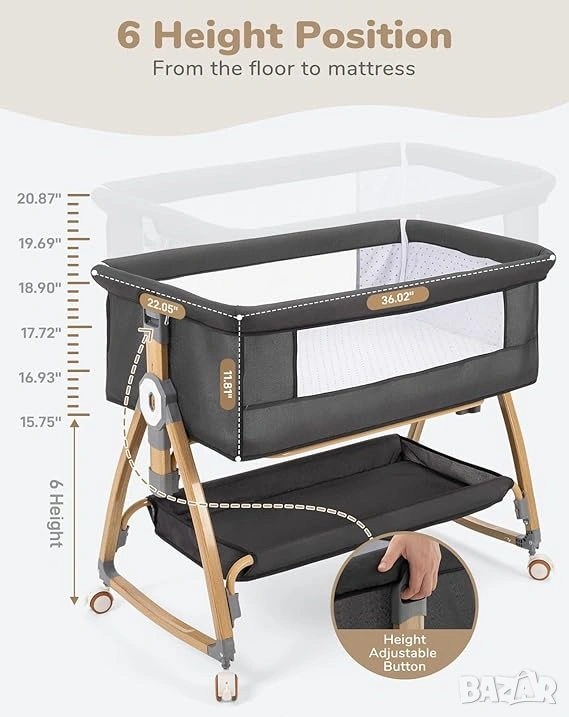 Перфектно съвпадение на височината: Възползвайте се от 6 регулируеми позиции на височина (от 15,75" до 20,87") за бебешкото кошара. Това осигурява безопасно и безпроблемно прилягане до вашето легло/диван за възрастни, тъй като се регулира към различни височини на матрака, като държи бебето ви удобно близо.