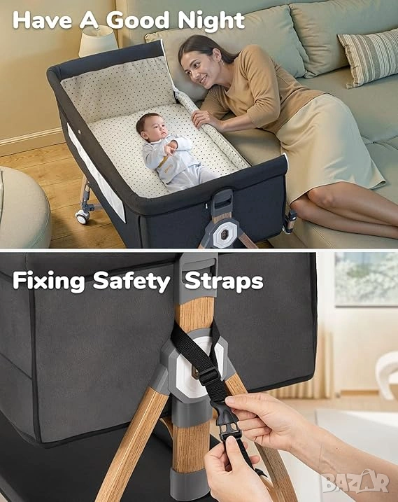 Сигурно и стабилно нощно креватче: Разполага с регулируеми презрамки за здраво закрепване на това нощно креватче към легла за възрастни (подходящо за ширини 1,2 м, 1,5 м, 1,8 м). Здравият триъгълен дизайн на рамката осигурява отлична стабилност, предотвратявайки преобръщане или движение за безопасността на вашето бебе точно до вас.