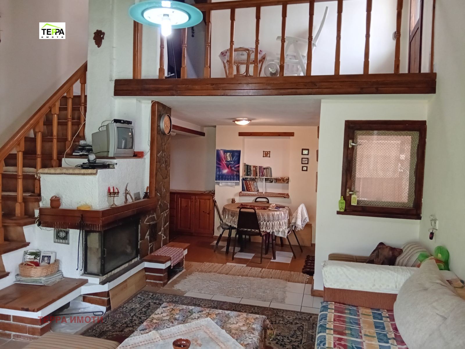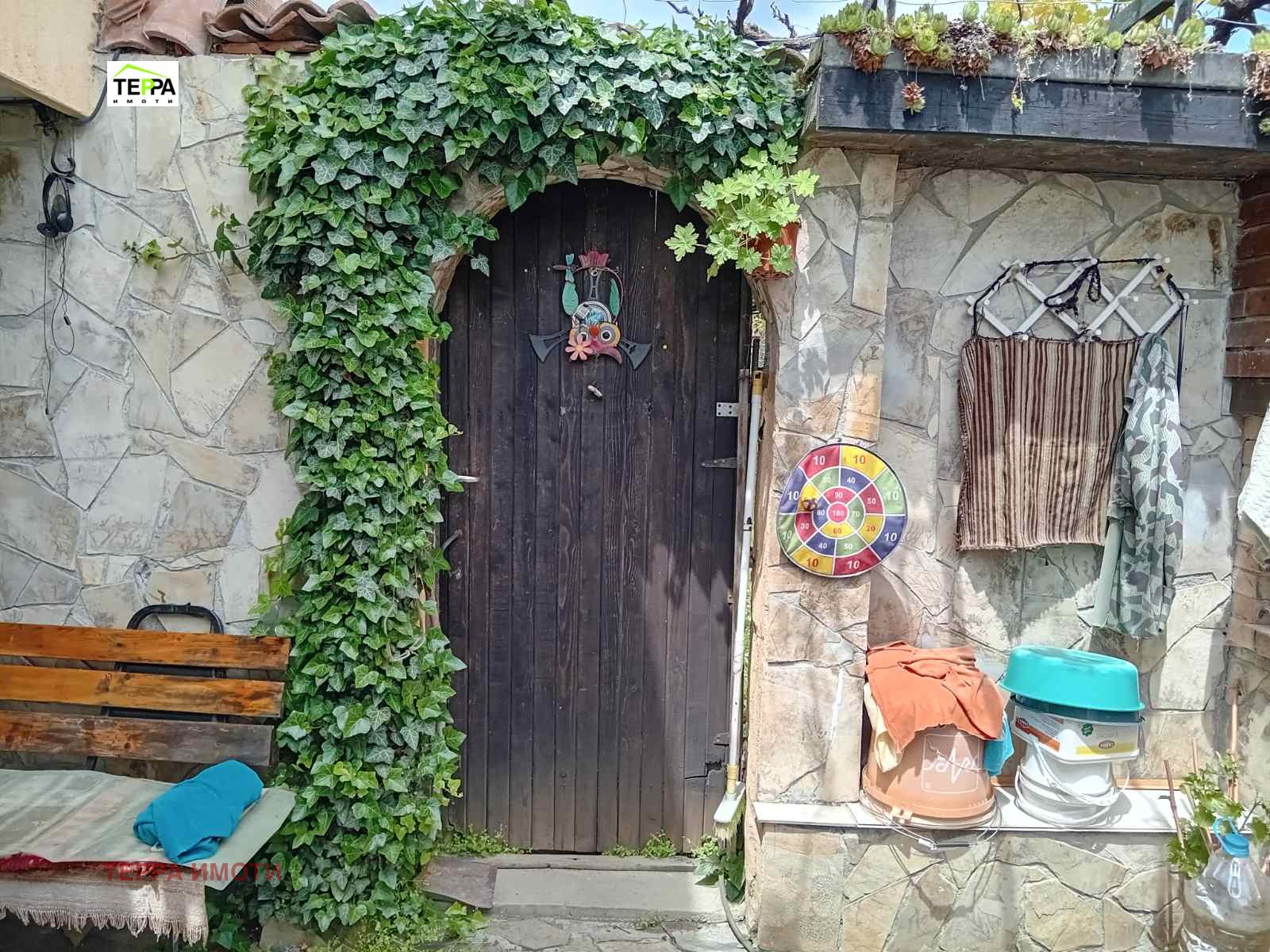 На първи етаж е разположена просторна всекидневна с френски прозорци, кухненски бокс, с обособени кътове за хранене и за отдих, санитарен възел.Има два входа с антрета.На втория етаж са разположени двете спални, едната от които със собствен санитарен възел.Има мазе 40 кв.м, което е сухо и използваемо.Отоплението е решено с климатициш и камина с топъл въздух.Има монтиран и слънчев колектор, свързан с 120 л бойлер.Изложението е основно юг, изток и запад.Имотът разполага със собствен водоизточник, с помпа и хидрофор.Продава се във вида от снимките.Дворът е 720 кв.м, подържан, засят с разнообразни плодни дръвчета и асма.Изградено е барбекю.Обособен е вътрешен двор с лятна баня и тоалетна, складови помещения.