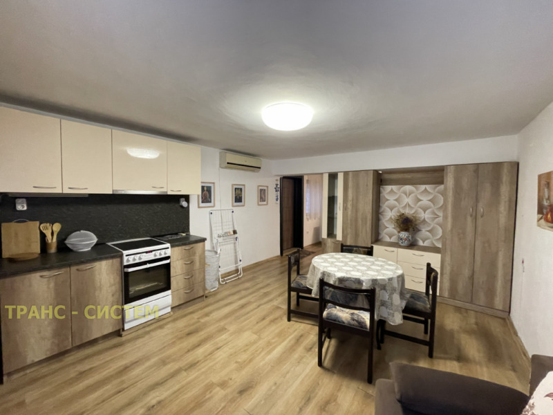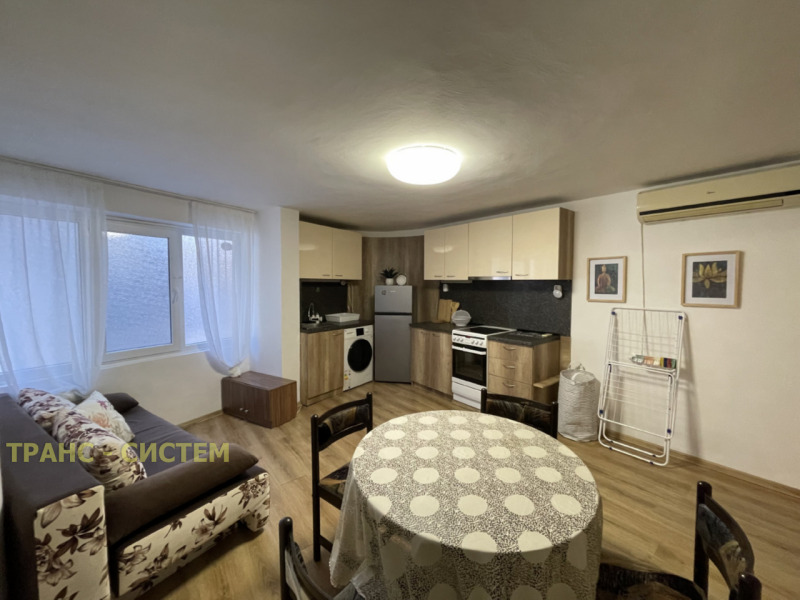 В Супер център до Славейково пазарче, близо и до Морската градина. В малка сграда на тиха улица. Това е компактен двустаен и е на партерен етаж. Разпределението е: дневна стая с кухненска част, спалня, антре и баня с WC. Имота е в много добър вид. Предлага се обзаведен. Нацяло оборудвана кухня - включително и ел. уреди - хладилник, готварска печка, пералня със сушилня, абсорбатор. Отопляването е решено с подово отопление, също и един климатик. С необходимата мека и корпусна мебел. Имота е с отделен вход и не се плащат такси по етажната собственост. Отдава се за дългосрочно ползване.