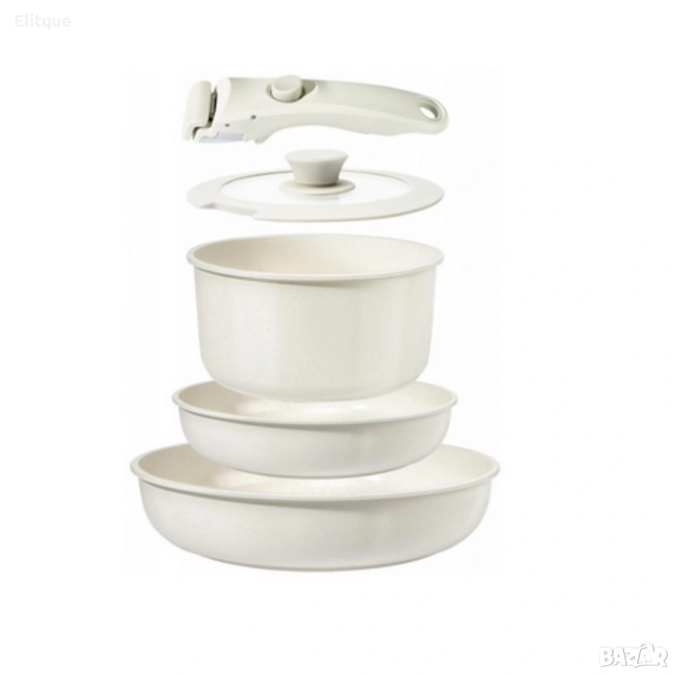 Материал: лят алуминий с незалепващо мраморно покритие; Комплект: 5 части; Съдържание на комплекта: Касерола Ø22 см – 3.9 л; Тиган Ø22 см – 1.9 л; Уок тиган Ø26 см – 3.5 л; Капак Ø22 см от закалено стъкло; Подвижна универсална дръжка; Източник на топлина: газови, електрически, индукционни, стъклокерамични и халогенни котлони; Поддръжка: препоръчително ръчно измиване за по-дълъг живот на покритието; Безопасност: подходящи за контакт с храни.