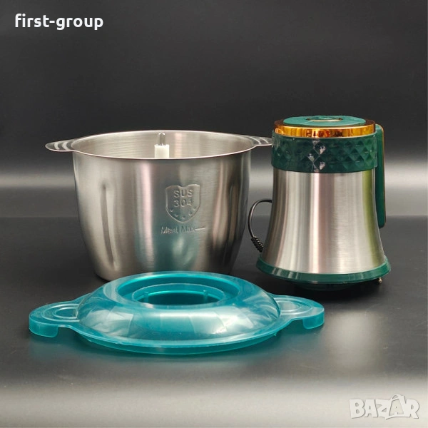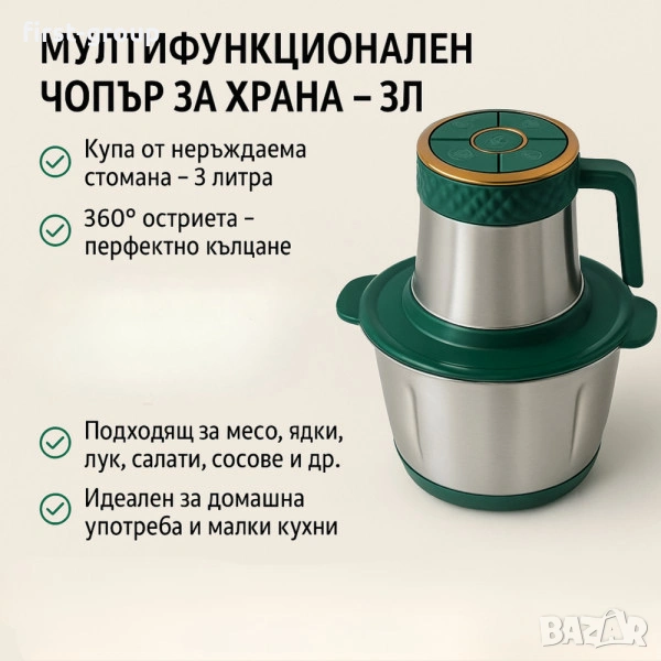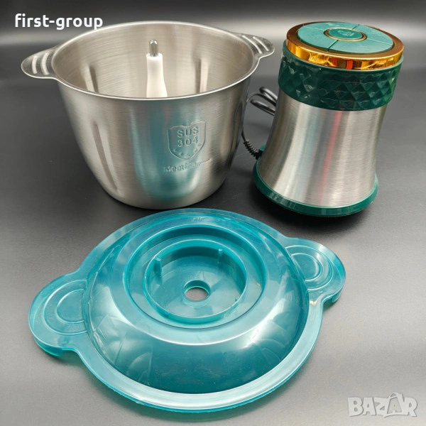 Лесен и удобен чопър за големи семейства или малки бизнеси. Има купа от неръждаема стомана с вместимост цели 3 литра. Мощният мотор задвижва цели четири лазерно заточени остриета, които накълцват за секунди, месо, зеленчуци, плодове, правят сокове и пюрета, кайма. Чопърът има и функция за месене на тесто. Невероятен и стилен дизайн – зелени елементи на мотора, които перфектно пасват със златистия пръстен. За всяка изтънчена кухня.