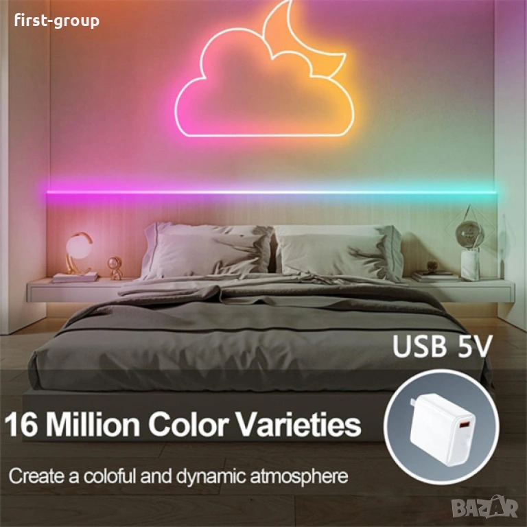 Комплектът съдържа: 5 м лента, USB смарт контролер, дистанционно 24 бутона, адаптер 220V, 10 монтажни скоби