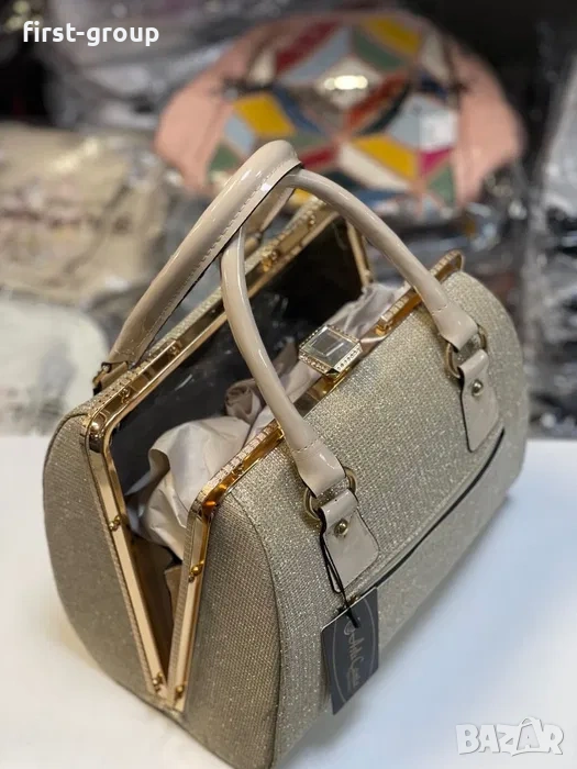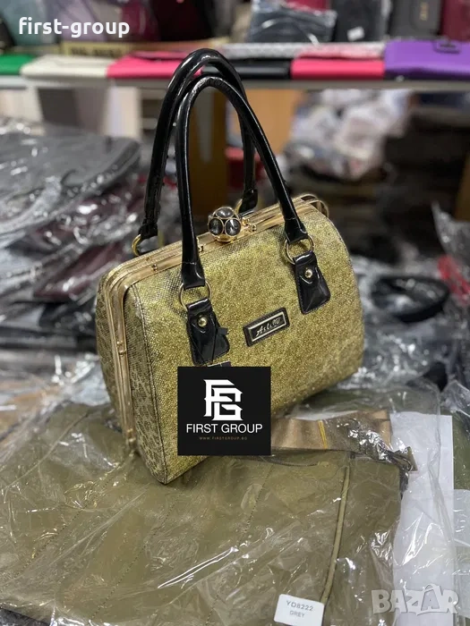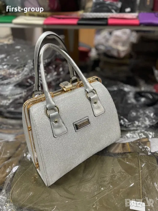 Екстравагантна дамска чанта с блясък , с твърда структура. Моделът разполага с голямо просторно отделение, закопчаващо се с ефектно копче декорирано с камъни. Малко вътрешно джобче с цип, в задната част. Две къси, твърди лачени дръжки. Дълга,лачена дръжка с регулираща дължина. Ефектна, декорираща рамка в златист цвят. Твърдо дъно с метални крачета.