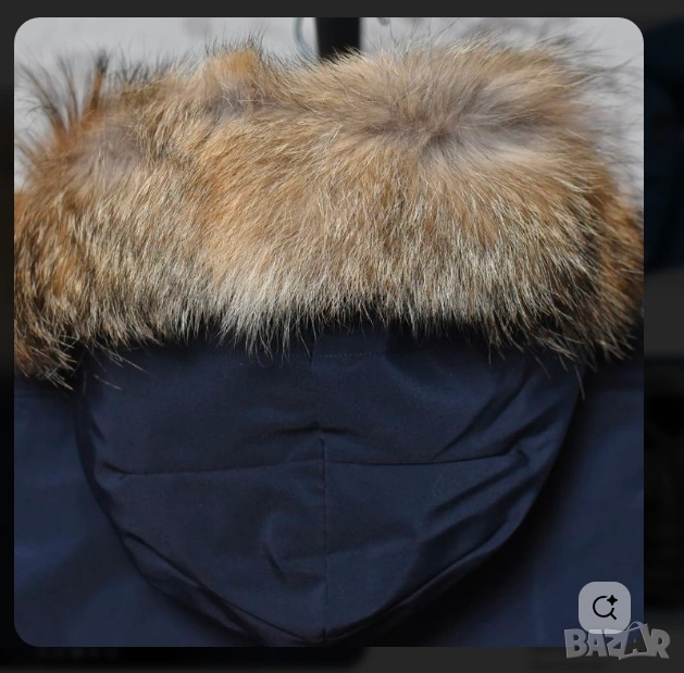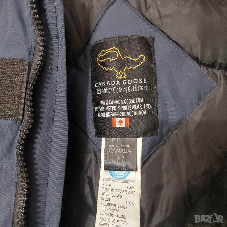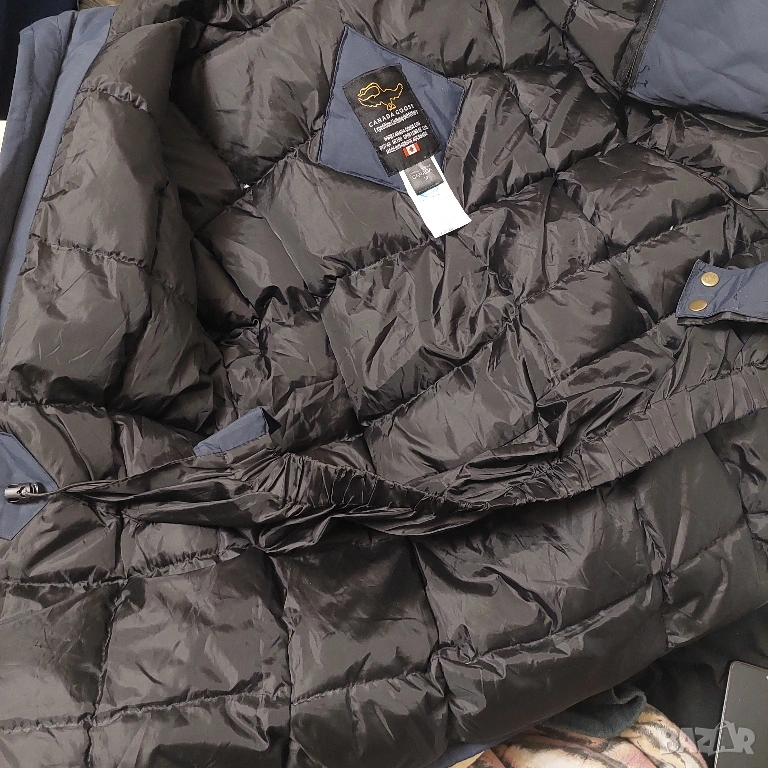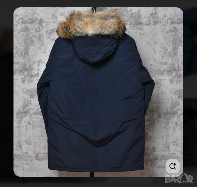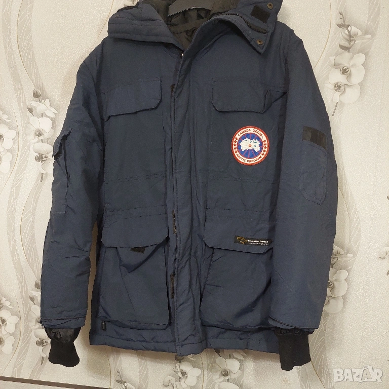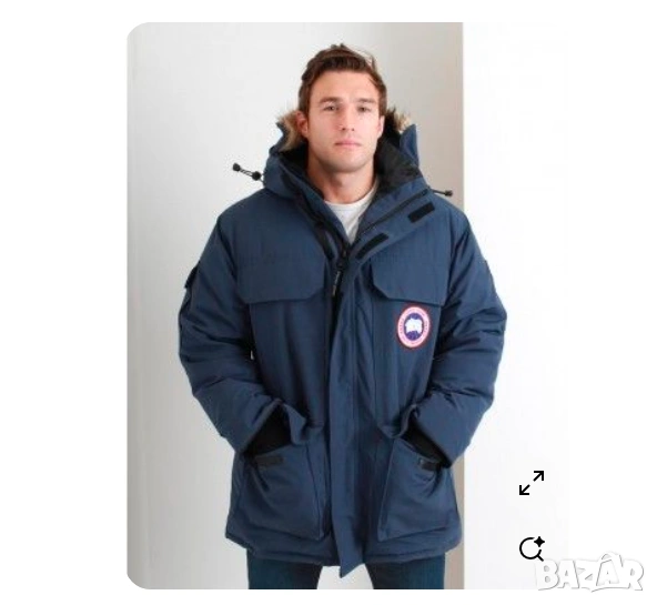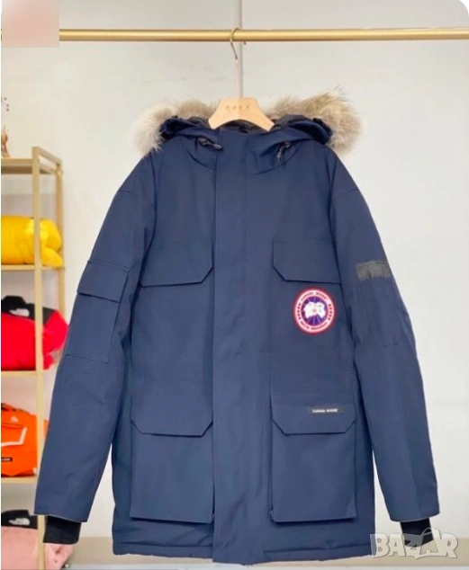 Canada Goose Expedition Parka в тъмно син цвят, проектирана да издържа на екстремни студени условия до -30°C и по-ниски. Якето е пълно с патешки пух и пера и разполага с множество джобове и регулируема качулка с козина.