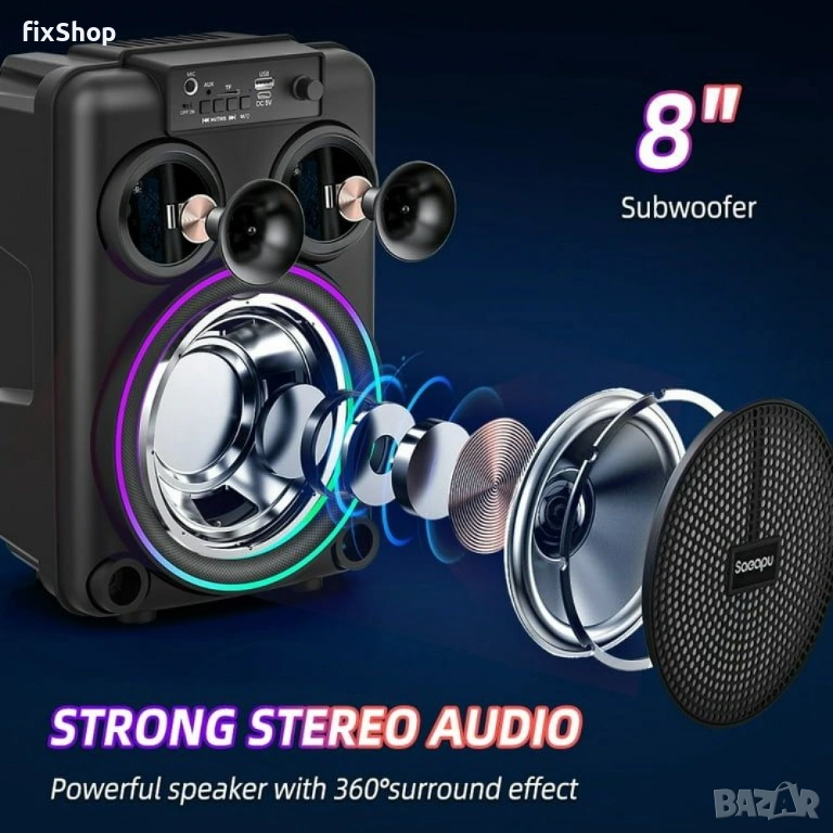 Отлично качество на звука: 8-инчов високоговорител с пикова изходна мощност 100 W усилва музиката значително без шум. Всеки детайл в музиката може да се чуе ясно, което ви кара да се чувствате комфортно и да имате отлично музикално изживяване.