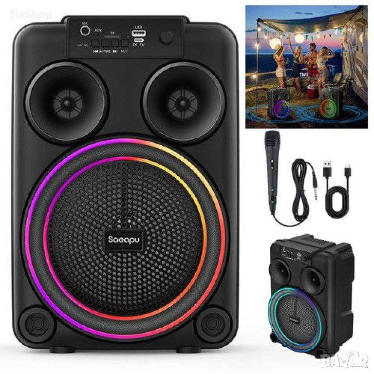 Преносима: Много преносима караоке система с горна дръжка за носене. Можете лесно да я вземете навсякъде, на къмпинг, плаж, пикник, тя няма да ви бъде в тежест. TWS функция: Нашите високоговорители поддържат функцията True Wireless Stereo (TWS), което ви позволява да сдвоите два високоговорителя едновременно. Просто натиснете продължително бутона за пауза за лесно сдвояване и се потопете в богато, стерео съраунд звуково изживяване.