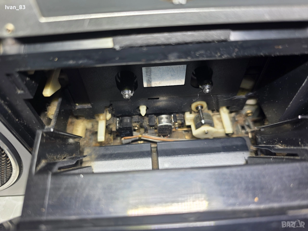 Работи на радио,касетният механизъм е за ремонт и почистване, уокмена също е за ремонт, липсва прожинката която държи капачето затворено и плекцигласа се е отлепил