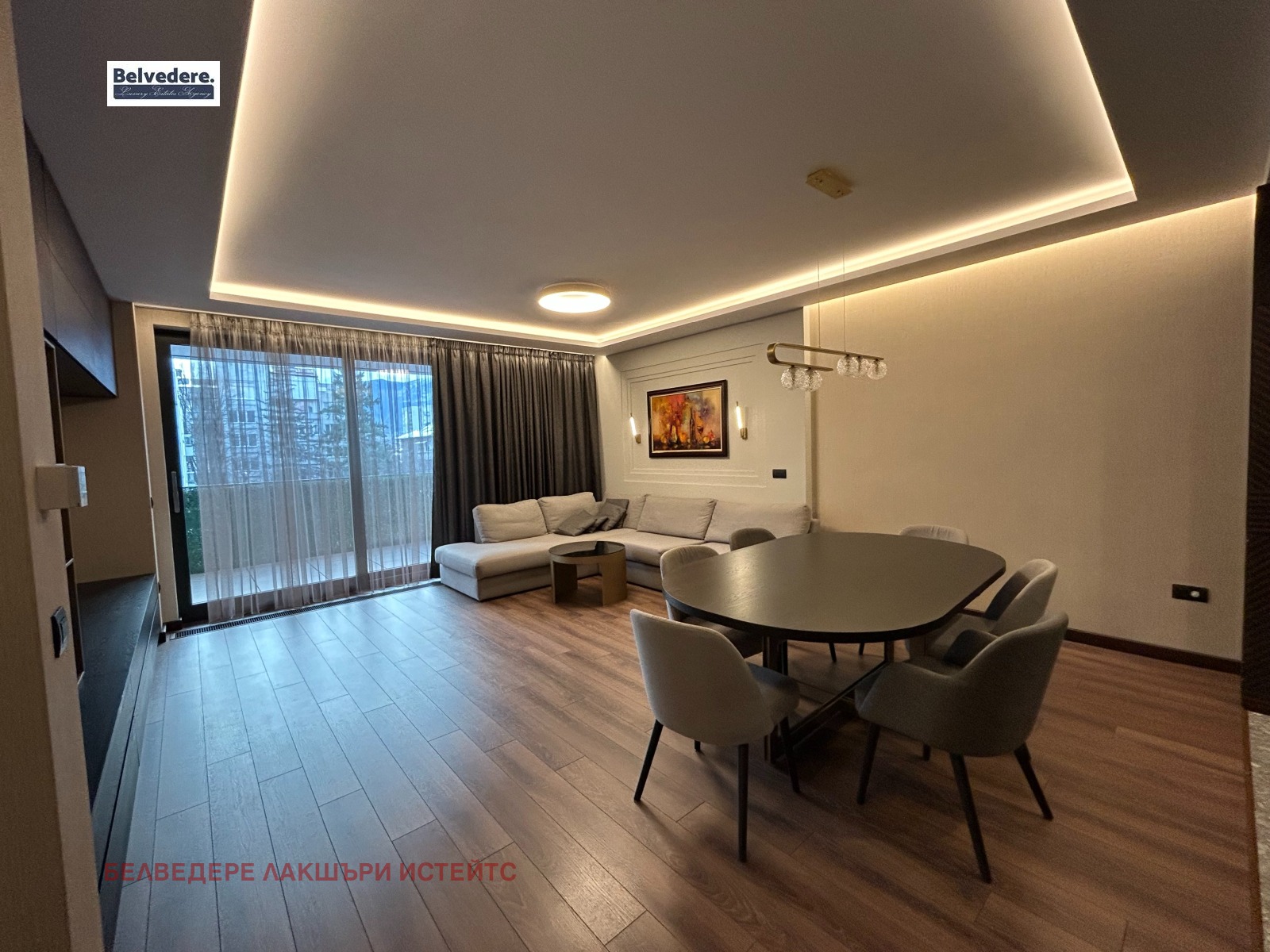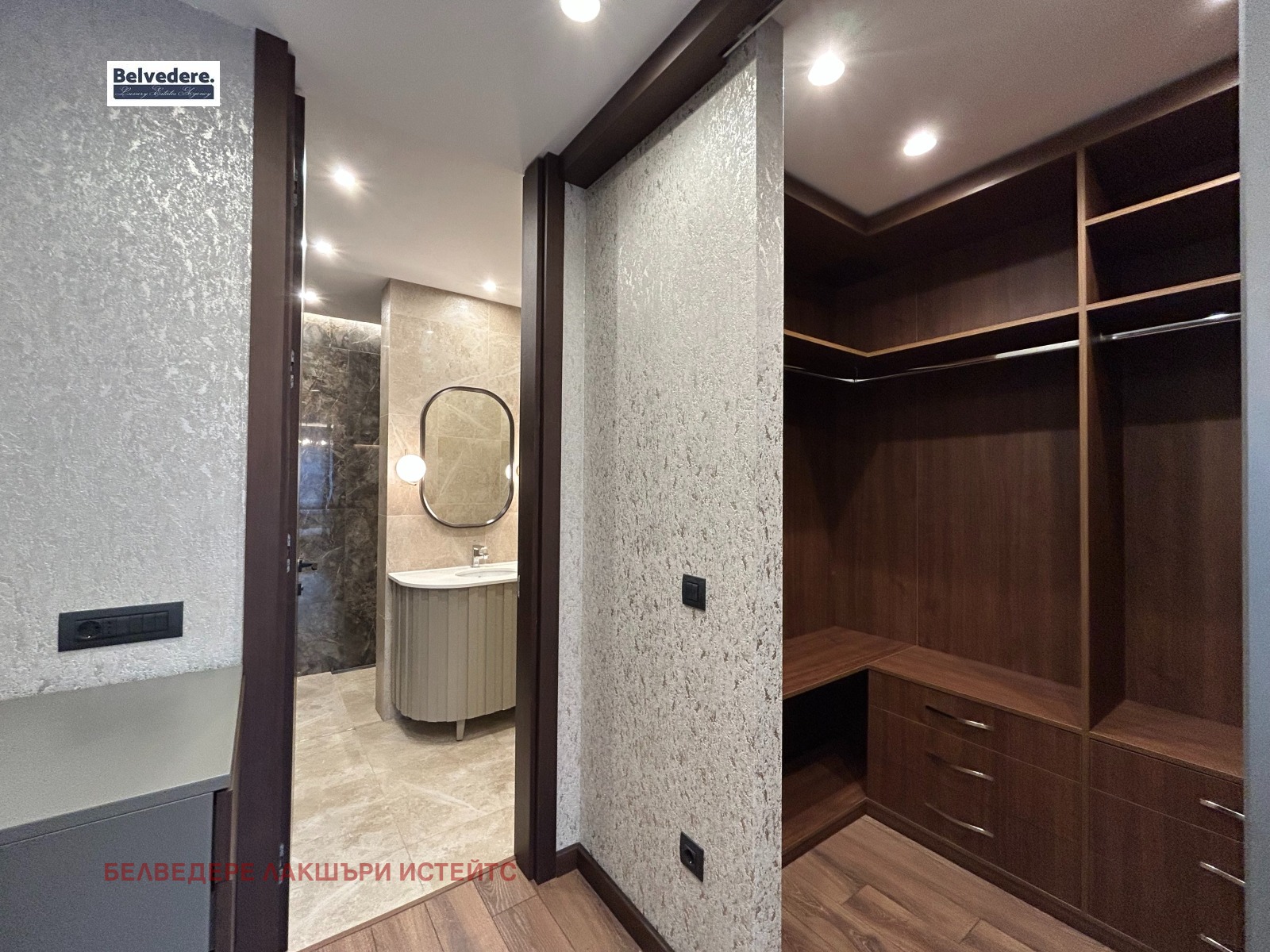 Разпределение:входно антре, килер, дневна с трапезария и кухненски бокс, излаз към балкон с южно изложение, родителска стая с прилежаща баня с тоалетна и гардеробна,втора стая с гардеробна,втора баня с тоалетна.Подземен гараж за 2 автомобила - 300 евро/ месец без ДДС. Такса поддръжка на общи части - 135 евро/ месец без ДДС.Обявената наемна цена е без ДДС.