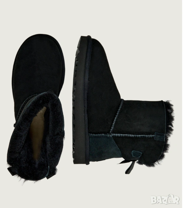 UGG Mini Bailey Bow II Boot в черен цвят. Този модел е актуализация на класическия силует, изработен от предварително обработена двулицева овча кожа и велур, за да отблъсква вода и петна.