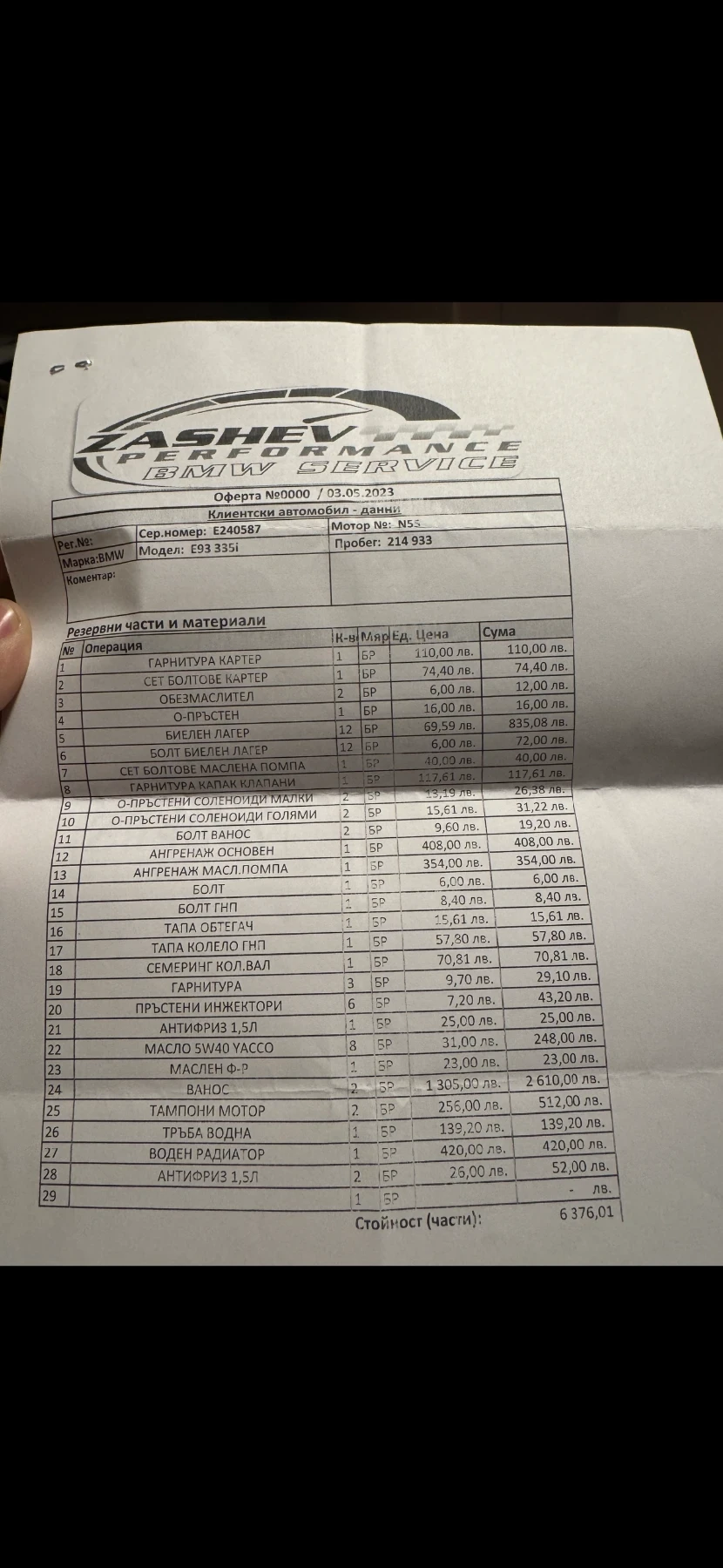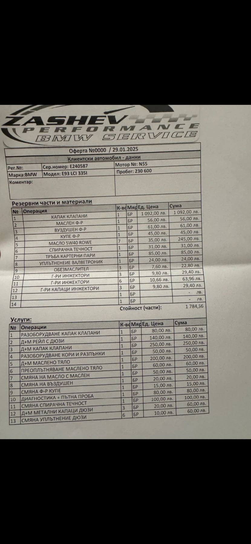 BMW E93 335i DCT LCI N55 M-pack За жалост е време да се разделя с моята тупалка, защото скоро ще ми трябва по-голям автомобил. ? Колата е брутална и се надявам да отиде в добри ръце. Описанието ще е дълго. Автомобилът е внесен от Швейцария през 2022г. като към настоящия момент е на 232 000км. Състоянието му е отлично. Никога не е претърпявал инциденти и няма никакви грешки. VIN: WBADX71000E240587 Не се кара зимата и се държи в гараж. Всички ремонти и поддръжка са извършвани в Zashev Performance само с ОЕМ части. ( Който разбира знае за какво става въпрос) Прилагам фактури за всичко извършено по колата при мен до този момент. Има монтиран даунпайп, чарджпайп, цяла M performance изпускателна система с Akrapovic накрайници- уникален звук. Невероятно удоволствие е да се кара със свален таван. Автомобила е с N55 мотора с туин скрол турбина- много по-надежден от пре фейса N54. Разполага с DCT автоматична скоростна кутия с двоен съединител от М3, която е изключително здрава и бърза. На M performance окачване е с регулируеми пружини. Обслужен преди 1000км. с всичко платено до февруари 2026 година и готов за каране. Винаги е обслужван на интервали от максимум 8к км. Поддръжка и сменени части: Нови тампони на мотора, сменени задължителните биелни лагери и вериги. Нов акумулатор в гаранция на 6 месеца. Нов радиатор и сменени с ОЕМ всички малки тръбички и маркучета от охладителната система. Сменена водна помпа и ремъци с всички ролки. Чисто нов ОЕМ Валвтроник, нов капак на клапаните, нови свещи и бубини, нови накладки, току що обслужена DCT кутия с двоен съединител, като е сменен датчик за температура на маслото на кутията с OEM BMW такъв, о-пръстени, гарнитура на картер, проверени съединители - всичко по кутията работи перфектно, нови ксенонови крушки, нови Angel eyes лед крушки, инспектиран твърд таван и помпа и сменено реле на помпата, всички гумени уплътнения по тавана и вратите се мажат по два пъти в годината, за да са гъвкави, тавана работи отлично и всички уплътнения са като нови. Няма аналог на тази Е93-ка в странта. Всичко по колата е обслужено или превантивно сменено, за да е в оптимално състояние. Разполага с мап с поп енд бенгс включващ се от копчето спорт. Автомобила е с налични катализатори и минава ГЪп без проблем с емисии и т. н. - отговаря на евро 5 и 4та еко категория ГТП ! Спецификации: Разполага с четири нови летни гуми Continental Sport Contact dot 2025 и чисто нови джанти спорт пакет style 359 19" ет34; без кривини, заварки, и тн. Цялостен ОЕМ M-пакет, сгъваем ветробран против завихряне ОЕМ - много рядко и скъпо нещо за намиране вече (мрежата , която се слага над задните седалки, за да не духа като се кара без покрив) , ел. рекаро с подгрев, надуване и памет, HI-FI озвучение, двузонов климатроник, CIC медия с последния ъпдейт - bluetooth, затъмняващи се огледала, къп холдъри, сензор за дъжд(автоматични чистачки), автоматични фарове, круз контрол, комфорт аксес (тавана може да се сваля от дистанционното) и много други неща които със сигурност пропускам. Общо са наляти над 20к в колата за последните 3 години и всичко е напълно изправно. Прилагам клипове и снимки, за да можете да добиете добра представа за колата. Намира се в София. Може да пишете на л. с. или да звъните на тел. 0884799992 за огледи и пазарлъци. Цена: 29, 999лв с възможен коментар. Възможен бартер за по-голям автомобил + доплащане.
