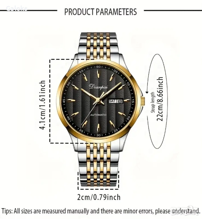 Последен модел автомат с ресурс от 43-45 часа с информативен циферблат (показващ : дата ; календар) и класически дизайн допълващ се от златиста каса и каишка от неръждаема стомана.