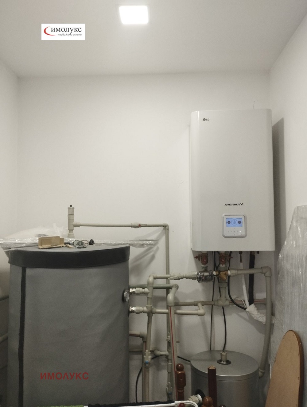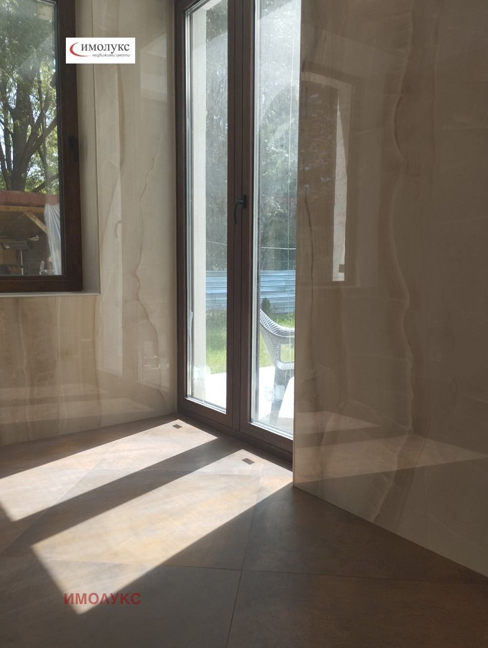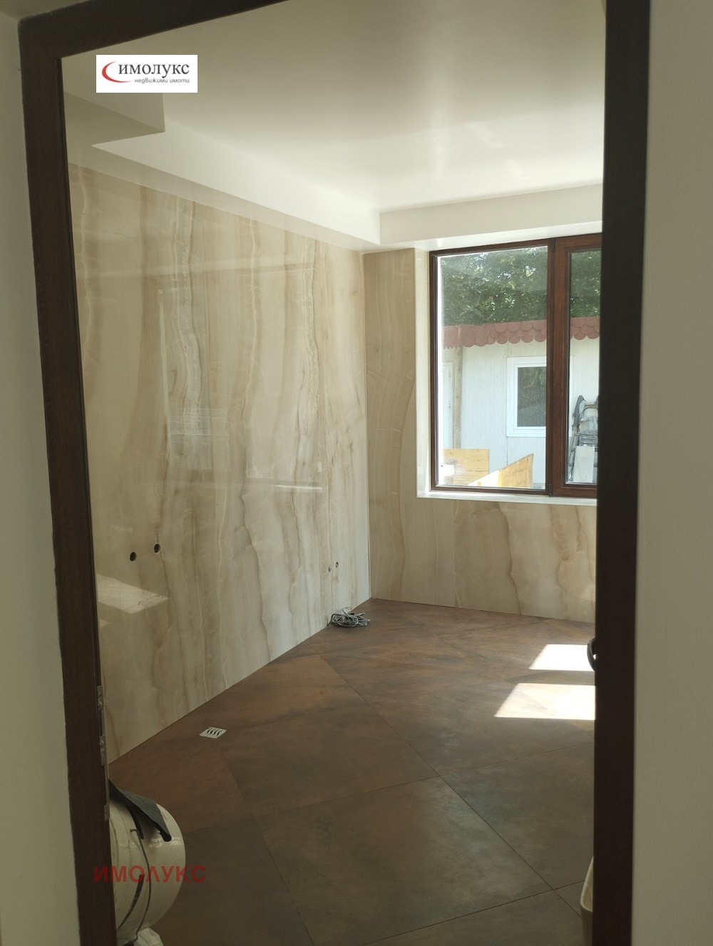 =настилки - гранитогрес плочи 80/80 см. , цвят леко бежово; стени - вароциментова шпакловка, положена фина мазилка на Кнауф и латекс Сатен на Делукс.