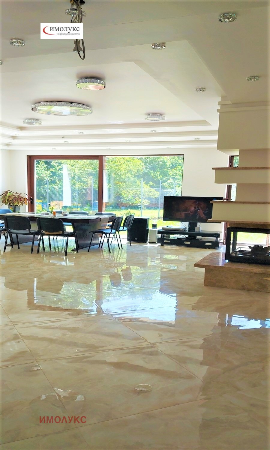 = цялото дневно пространство е с френски прозорци, 4 врати към двора две с плъзгане с повдигане и две с отваряне и ножица