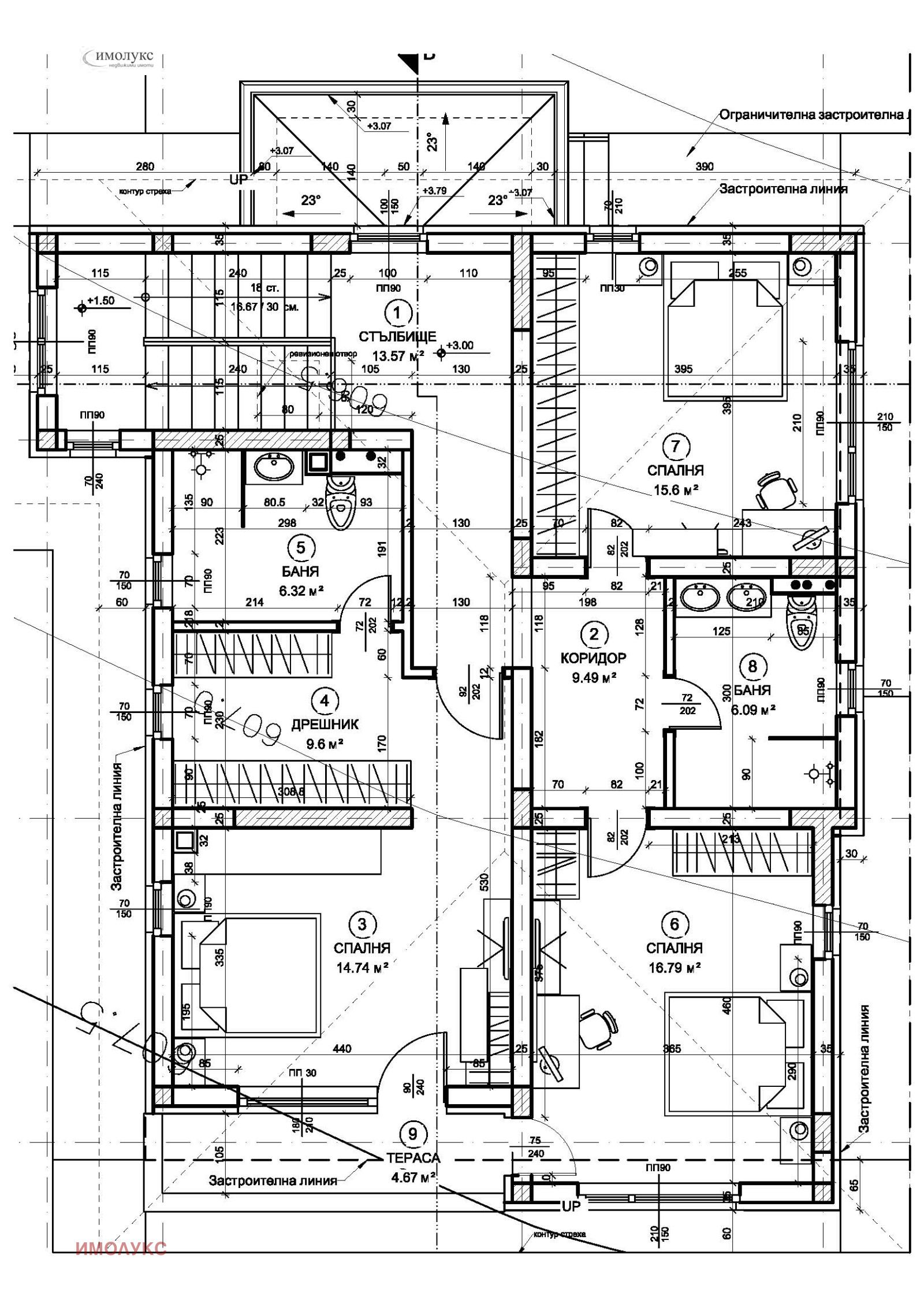 Разпределение: има четири самостоятелни спални, просторен хол със светла кухня, три бани с тоалетни, техническо помещение, тераса и около 60 кв.м. подпокривно пространство с капандури, което е като бонус, извън общата площ от 235 кв.м. на двата основни етажа;