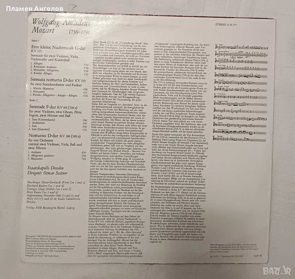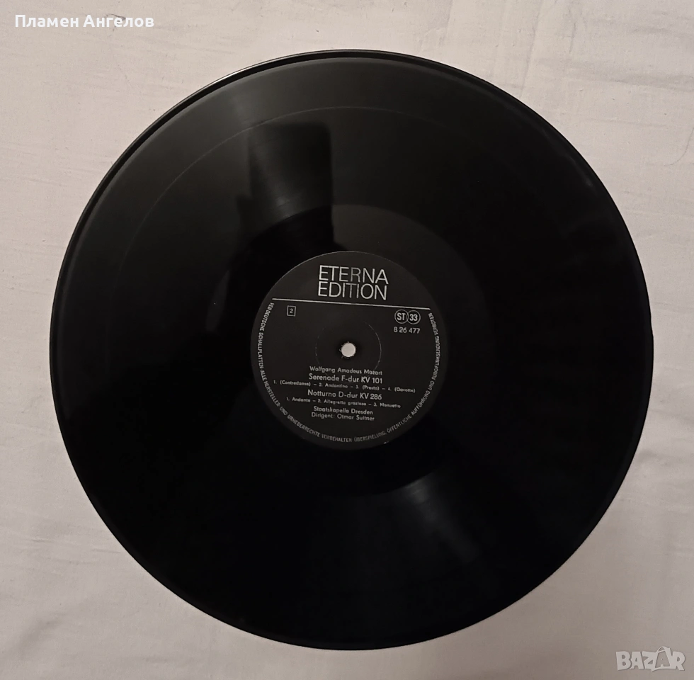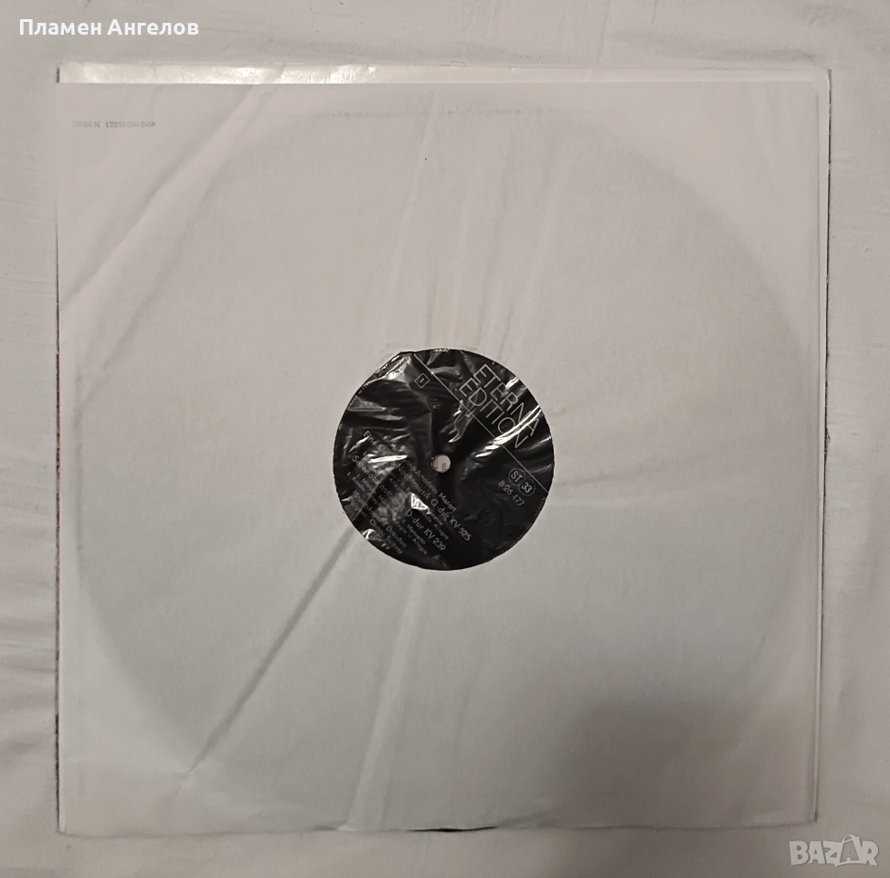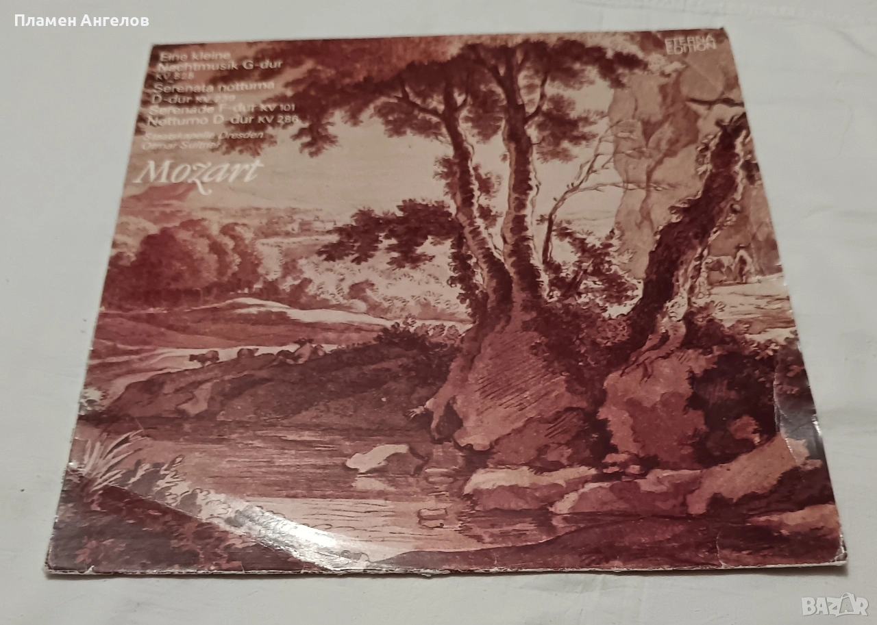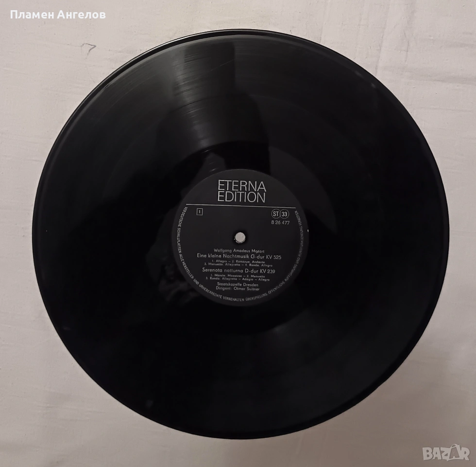 Грамофонна, ванилова плоча на "Eterna Edition" с класическа музика на Моцарт. Изпълнение на Държавния оркестър Дрезден. Плочата включва "Малка нощна музика," "Нощна серенада", Серенада да F-dur, Ноктюрно. Издадена през 60те,70те години. Плочата е нова, без драскотини, само по обложката има следи от времето.