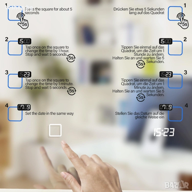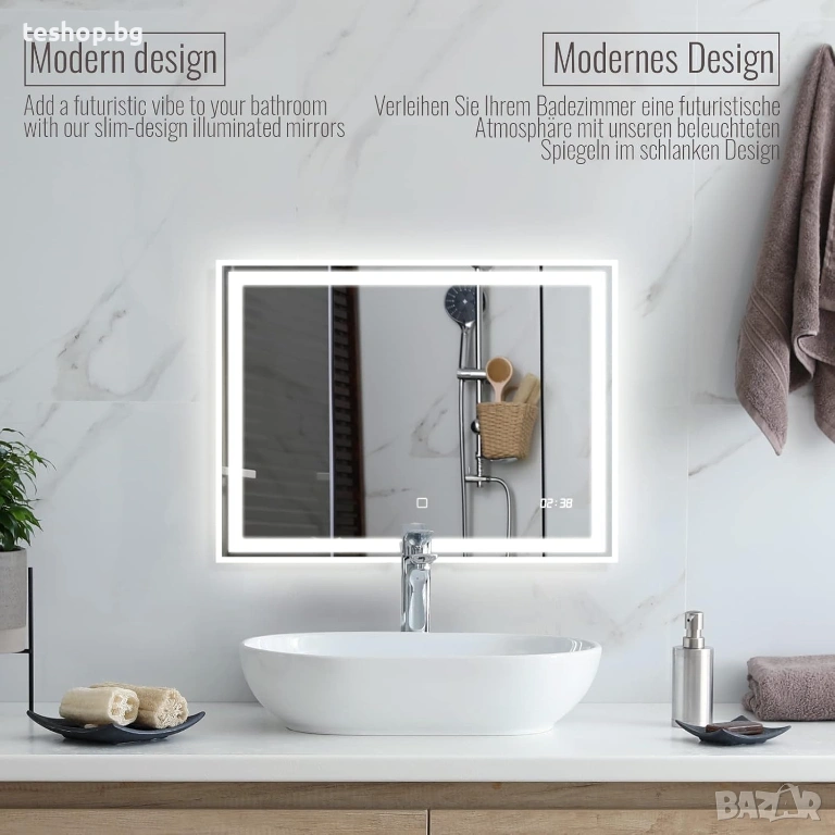 АКСЕСОАРИ: Това стилно огледало е оборудвано със сензорен ключ, дигитален часовник с настройки за дата, интелигентна памет, функция за затъмняване и анти-фог функция