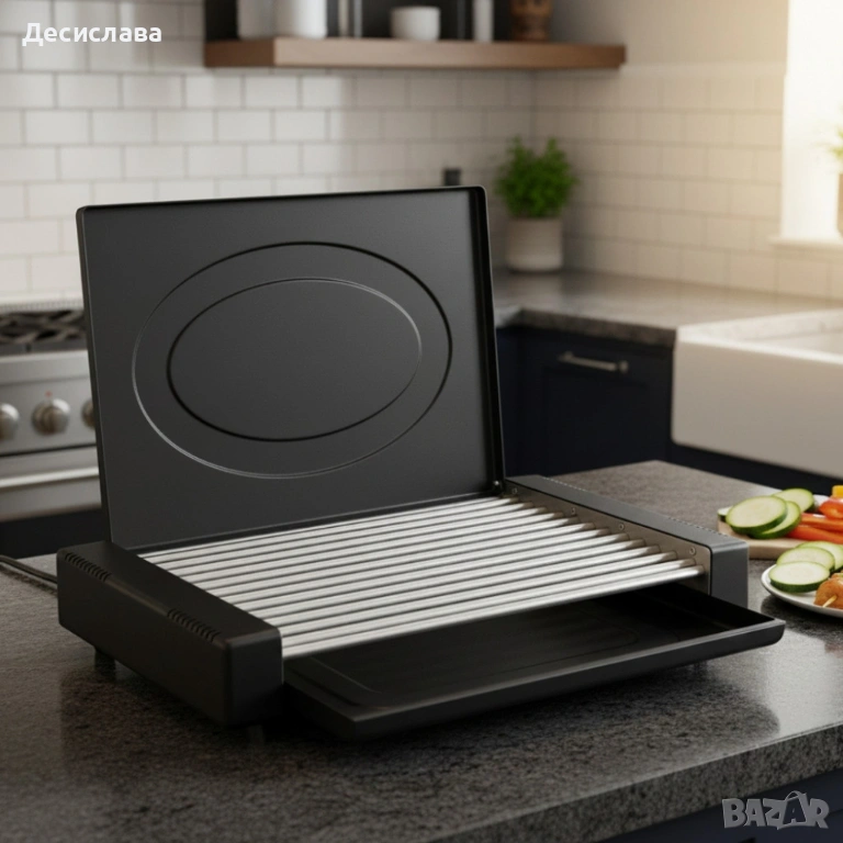 Електрическа скара с капак Oliver Voltz OV51015QC – 1800W мощност за бързо, чисто и равномерно готвене у дома. Плот 35 x 22 см с метални ребра от неръждаема стомана и стабилен черен корпус. Разполага с тавичка за вода и мазнина, бутон ON/OFF със светлинен индикатор и удобна чистачка за ребрата. Работи на 220–240 V, без нужда от батерии. Размери на уреда: 43 x 25 x 7.5 см. Идеална за здравословно и бездимно приготвяне на храна.
