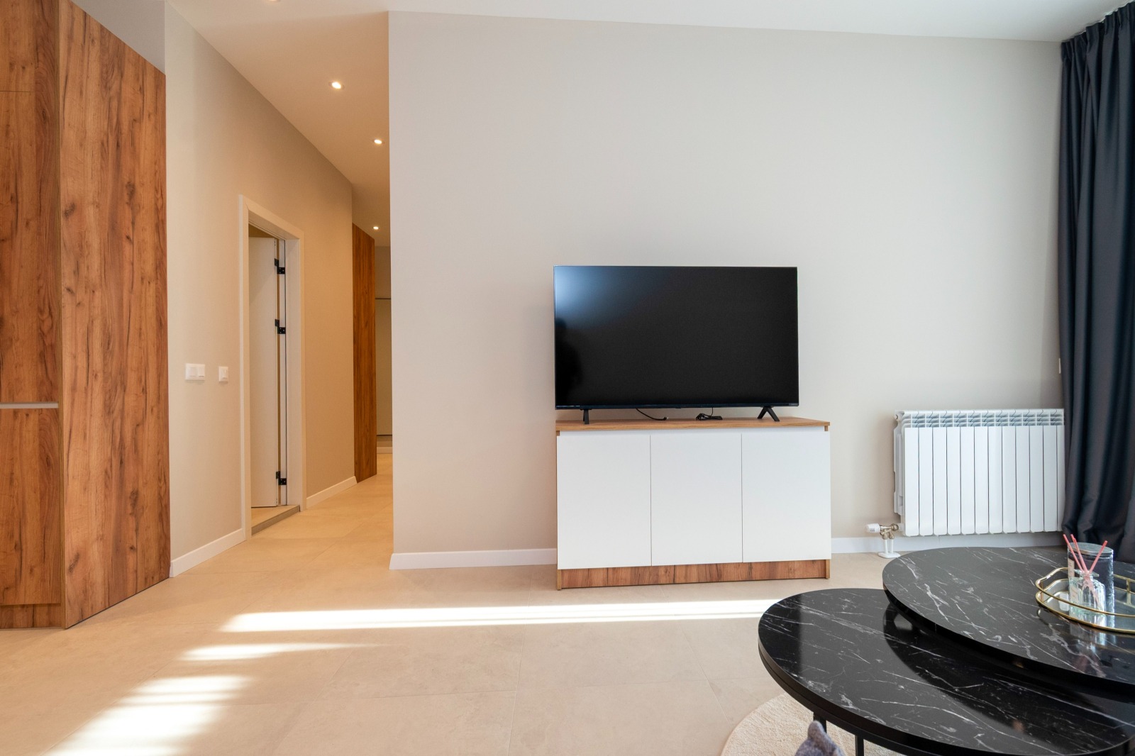 Жилището е завършено и обзаведено по индивидуален дизайнерски.Състои се от просторен двевен тракт с мека мебел, трапезарна част с вградена кухня с всички неоходими уреди за едно домакинство. Две спални, две бани и тераса. Отоплението е на газ с индивидуално котле, има и поставени климатици във всяко едно помощение за допълнителен комфорт.