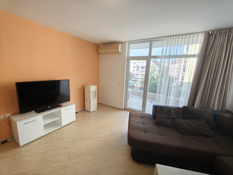 Апартаментът включва широк входен коридор, голяма дневна зона с обновен кухненски бокс, две самостоятелни спални, две бани с тоалетни и просторна тераса с приятна гледка към басейна и вътрешния двор на комплекса. Имотът се предлага напълно обзаведен и оборудван, готов за незабавно ползване или отдаване под наем през целия сезон.