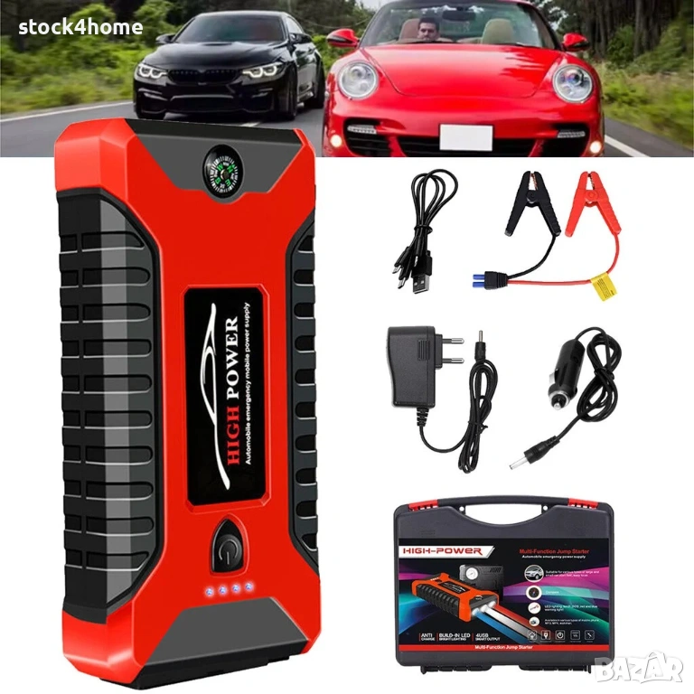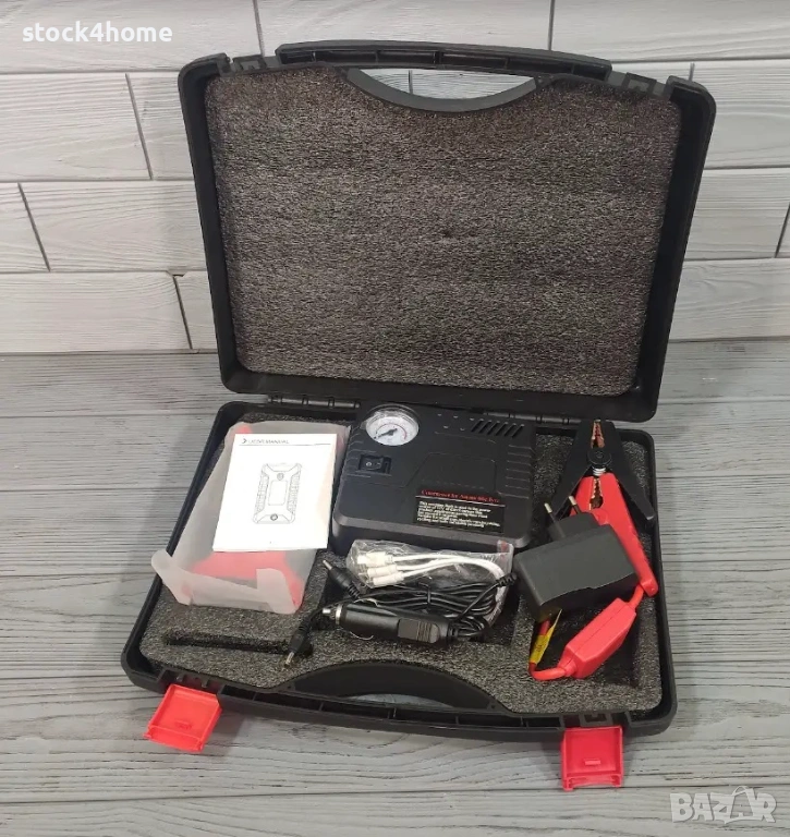 Мултифункционалният стартер е изработен от здрава пластмаса в ярък червен и черен цвят, което му придава модерен и стилен вид. Компактният му размер го прави лесен за пренасяне и съхранение, а ергономичната форма осигурява комфорт при използване. Разположените портове и манометър на устройството са лесно достъпни и удобни за работа дори в тъмни условия благодарение на вграденото LED осветление.