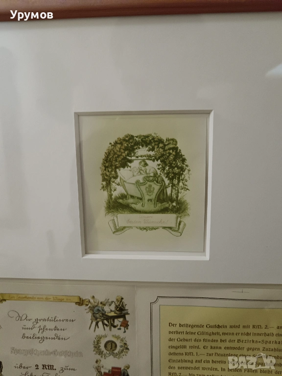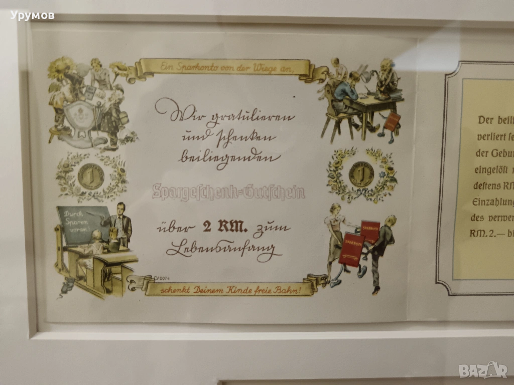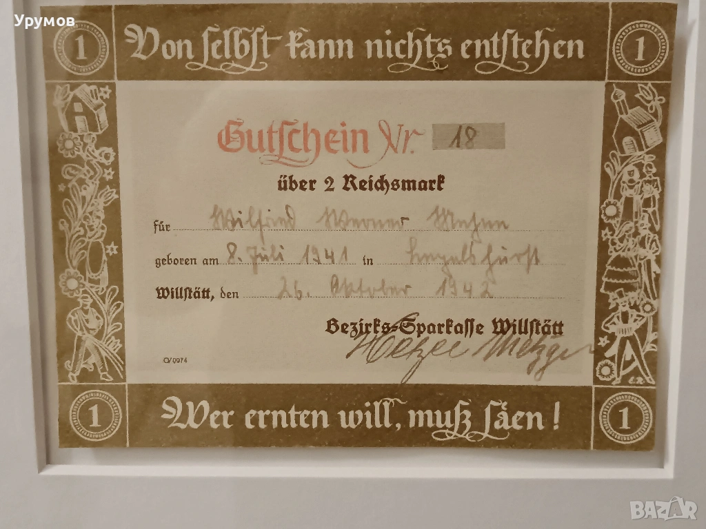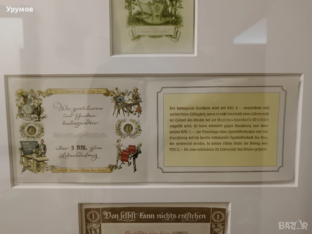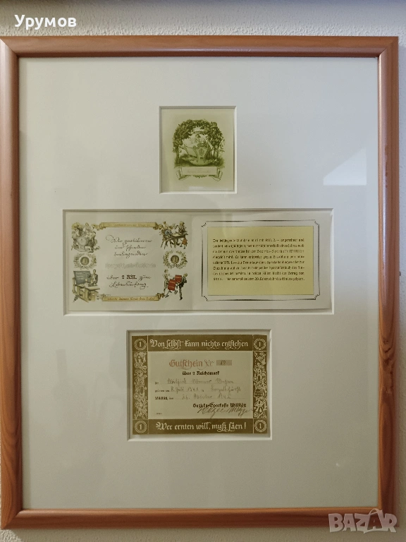 2 бр. спестовни ваучери подарявани от държавата при раждането на дете на стойност 2 райхсмарки всеки в обща рамка. Ваучера /долу/ и сертификата за откриване на първа спестовна сметка на дете /в средата/ са издадени от Bezirks-Sparkasse Willstätt (Областна спестовна банка Willstätt). Ваучера е с дата на издаване 26 октомври 1942 г. Запечатани в паспарту под стъкло и рамкирани. Размер на рамката 44/54 см. Изключително състояние.