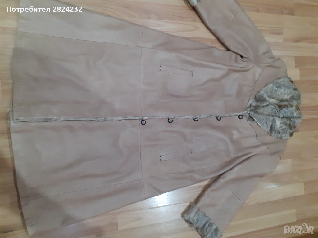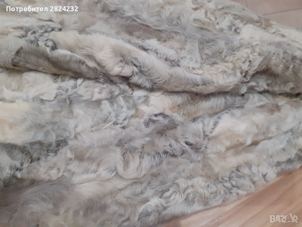 Гръдна обиколка 114см св разкроен модел долната част е 174 обиколка естествена кожа от вън и естествен косъм от вътре астраган в отлично състояние няма следи от употреба дължина 123 см висок клас кожа за ценителки