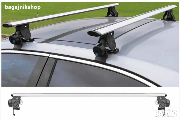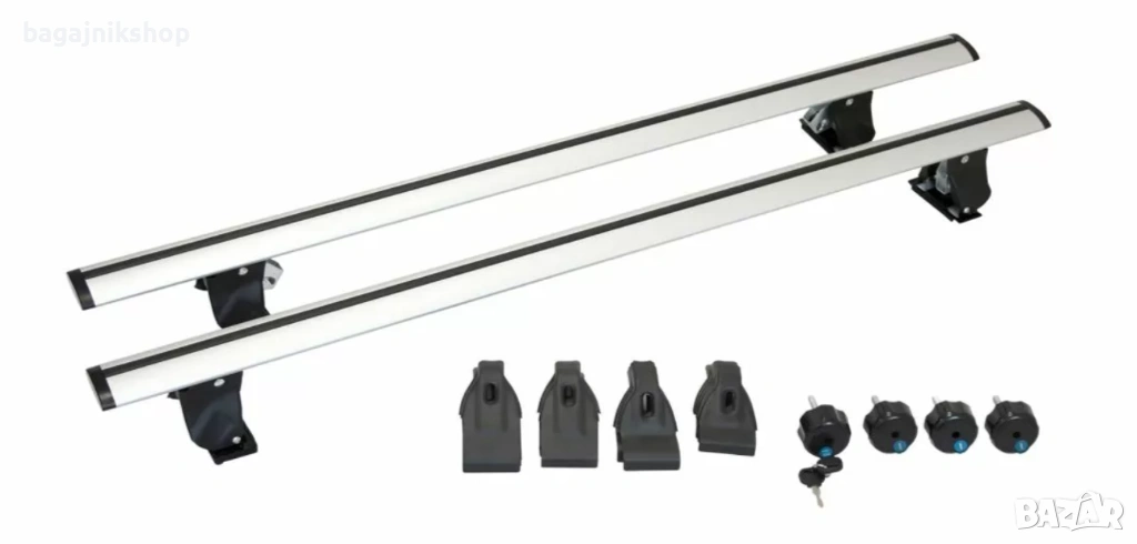 Цената е за 2 бр. алуминиеви греди, 4 вида приставки, 4бр. гумено уплътнение за улеят от горната и долната страна на гредите, 2бр. ключове и инструкции за монтаж.