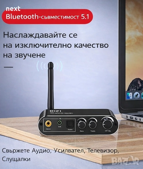 + Цифров Bluetooth предавател | Bluetooth 5.1 технология: Изпитайте стабилно предаване на звук без забавяне с Bluetooth 5.1, осигурявайки обхват от 20 метра без препятствия.