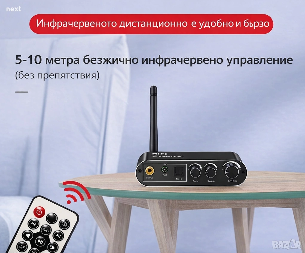 + Удобни за потребителя контроли: Регулирайте силата на звука и превключвайте между режими на бас, като използвате включеното инфрачервено дистанционно управление, опростявайки аудио изживяването ви.
