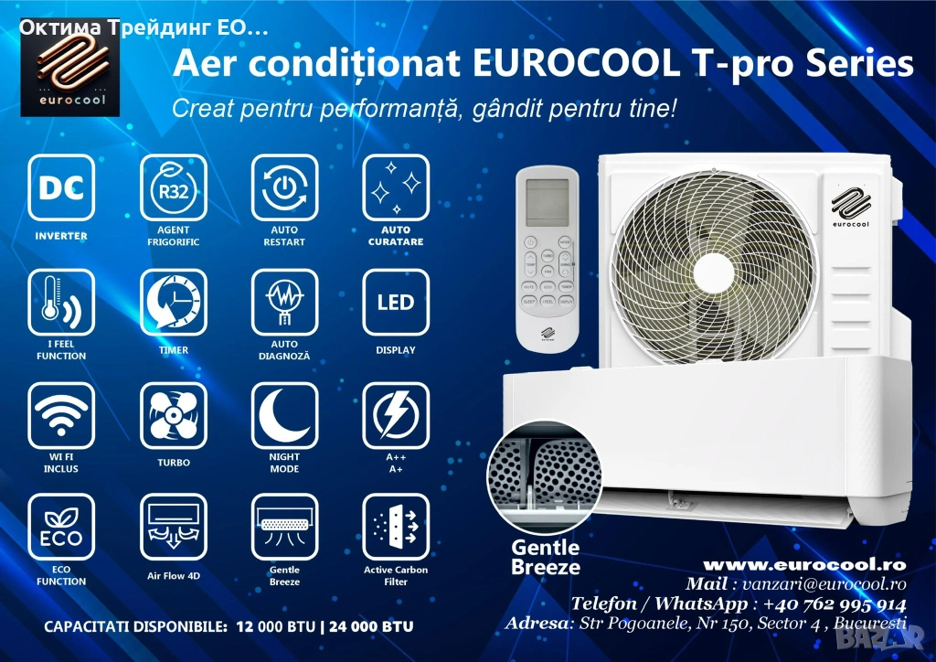 Климатик EUROCOOL T-PRO, 12000 BTU, R32, инверторен, Wi-Fi, филтър с активен въглен, нежен бриз