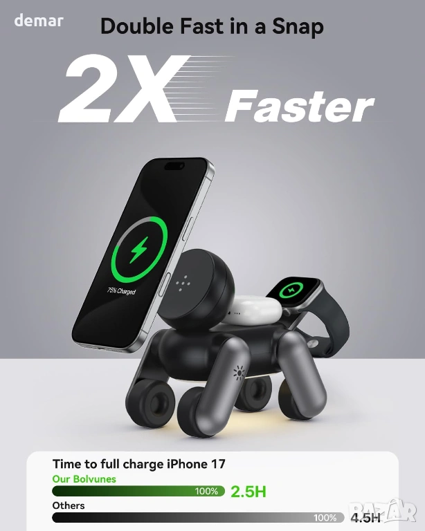 Тази 3-в-1 магнитна безжична зарядна станция ви позволява да зареждате телефона, часовника и слушалките си едновременно от една компактна стойка, осигурявайки бързо и стабилно зареждане, когато се използва с включения 20W захранващ адаптер. Тя се отличава с игрив, но практичен дизайн с регулируеми крачета, които ви позволяват да превключвате между плоско и изправено положение за удобно гледане без ръце по време на зареждане. Силното магнитно подравняване гарантира, че устройствата щракват сигурно на мястото си за ефективно зареждане както в портретна, така и в пейзажна ориентация. Зарядното устройство поддържа зареждане с калъф с допълнителни защити за безопасност за надеждна ежедневна употреба, а вградената нощна лампа с сензорно управление с множество нива на яркост и топлина го прави подходящо за употреба до леглото, без да нарушава съня.
