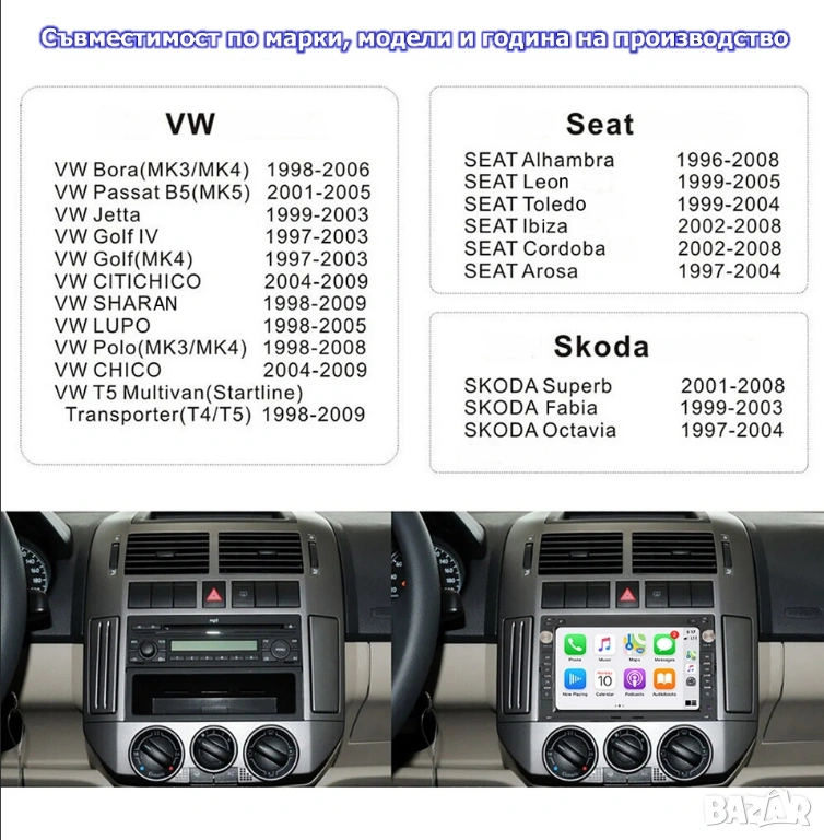 Списък с марките и модели на автомобили, на които пасва тази мултимедия, има в началото на публикацията. ОБЪРНЕТЕ ВНИМАНИЕ ДАЛИ ФОРМАТА НА ПРЕДЛАГАНАТА ОТ НАС МУЛТИМЕДИЯ ОТГОВАРЯ НА ОТВОРА НА СРЕДНАТА КОНЗОЛА НА АВТОМОБИЛА ВИ, ВГЛЕДАЙТЕ СЕ В ЪГЛИТЕ.
