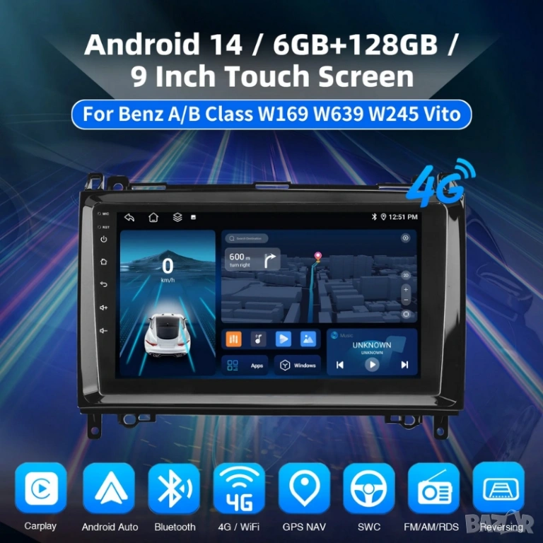 Mercedes Benz A/B Class W169 W639 W245 Vito 9” 2-DIN мултимедия с Android’14 6/128GB