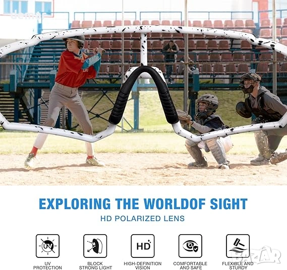 Тези детски спортни слънчеви очила са с поляризирани UV400 лещи, които блокират 99,99% от вредните UVA и UVB лъчи, помагайки за защита на малките очи по време на дейности на открито. Изработени с ултралека рамка TR90, тежаща само 24 грама, те са лесни за носене от деца за продължителни периоди. Ветроустойчивият дизайн намалява дразненето на очите по време на бързо движение, а ергономичната форма с меки възглавнички за носа и ушите осигурява сигурно и удобно прилягане при активни спортове като бейзбол, колоездене, бягане, туризъм и голф.