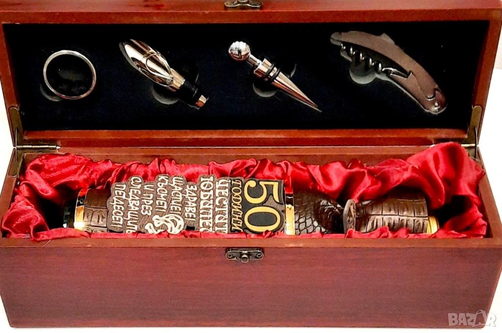 Луксозна, дървена кутия с драперия и винени аксесоари в комплект с авторска бутилка Дървото на живота - декорирана с истински монети или Колелото на живота. Предлагаме я и в комплект с декорирана бутилка с кожа, дървена плочка с пожелание за юбилей, и златни цифри 50, 60, 70 или 80 години.
