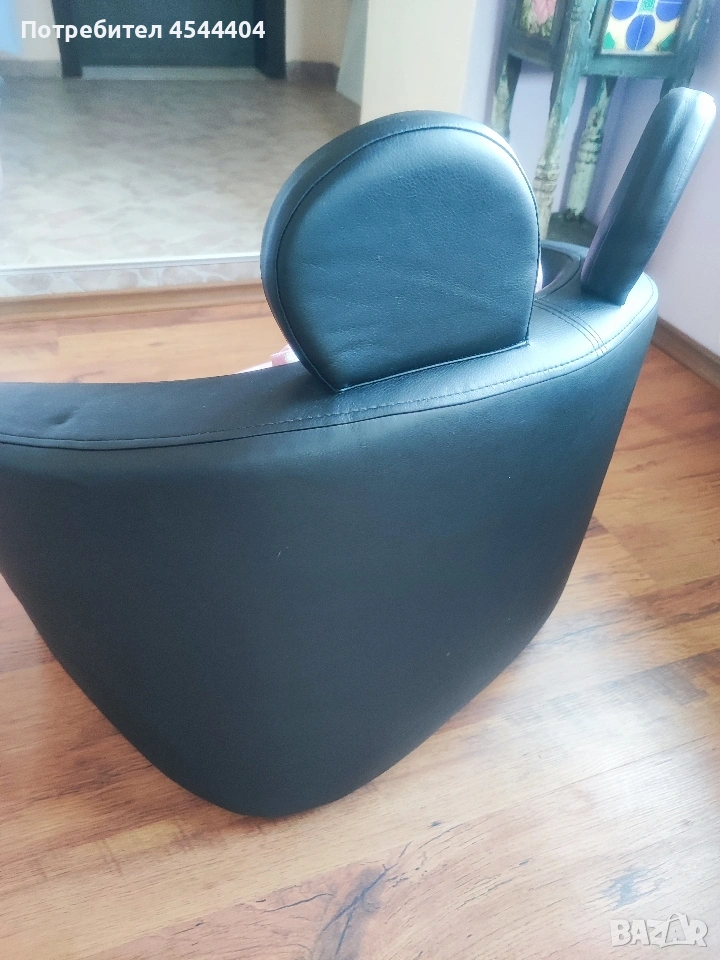 Детско кожено/изкуствена кожа/ кресло,разтегателно,удобно, използвано малки време, изработено по поръчка,с р-ри : ширина -64 см., дължина на възглавницата в отворено положение - 71 см. Без забележки е.