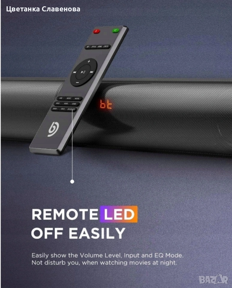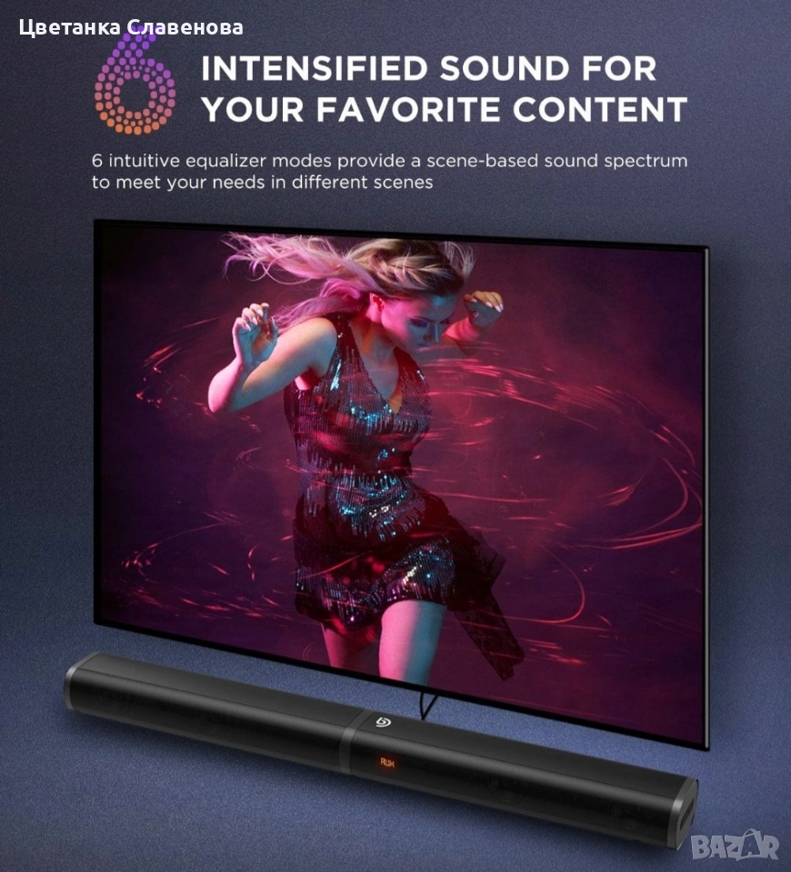190W пикова мощност: 190W супер мощност, подходяща за употреба на закрито и открито. В същото време не изкривява звука, когато силата на звука е сравнително висока. Мощен бас: 5,25" субуфер плюс уголемен въздуховод осигуряват повече пространство за предаване на баса. Този саундбар има и регулируем бас, който може да се настройва фино от 1 до 6.