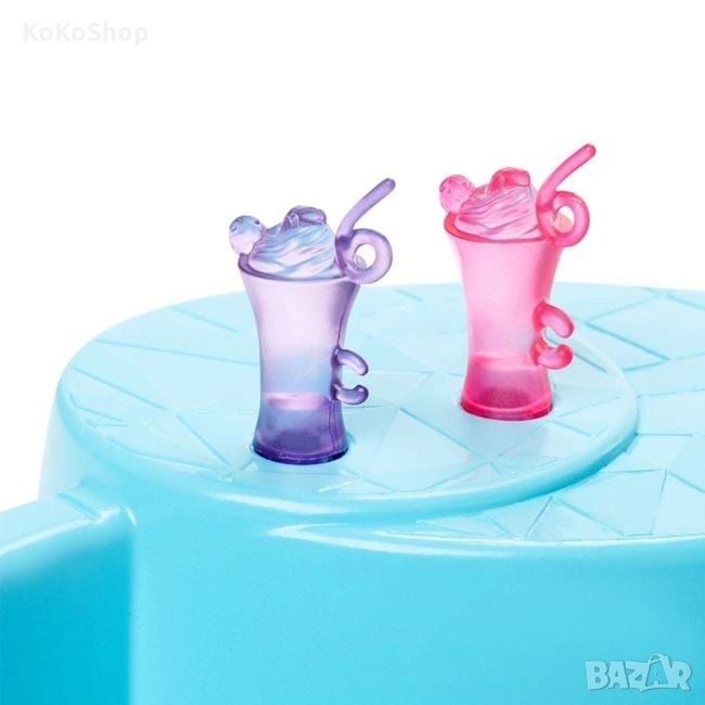 Куклата Barbie®, в ярък бански по последна мода, е готова за парти на басейна! Напълни басейна с вода, настани я удобно на мястото за сядане и , я разхлади с освежаващ коктейл.
