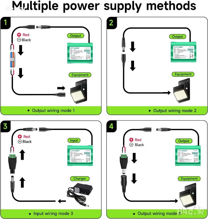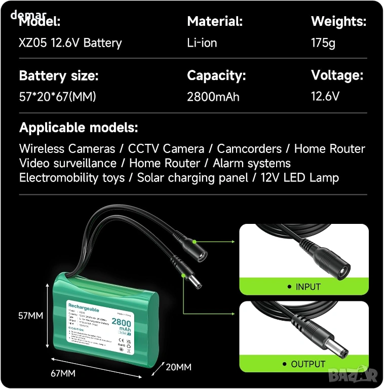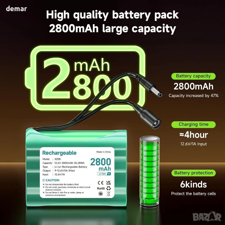 Тази акумулаторна 12V литиево-йонна батерия предлага висок капацитет от 2800mAh без ефект на паметта, осигурявайки стабилно и надеждно захранване в компактен и лек дизайн. Комплектът „Направи си сам“ включва свързващ кабел DC5521 и множество адаптерни щепсели, позволяващи гъвкава конфигурация за различни приложения. Тя поддържа множество опции за зареждане, включително включеното 12.6V зарядно устройство, с ясна индикация за състоянието на зареждане и вградена интелигентна защита за безопасна работа. Проектирана за широка съвместимост, тя може да се използва с различни 12V устройства, като радиостанции, LED осветление, камери, рутери, алармени системи, оборудване за наблюдение и друга електроника, изискваща надеждно преносимо захранване.