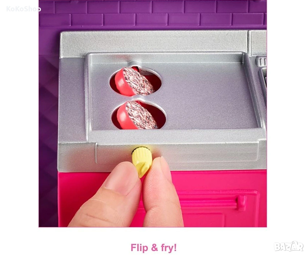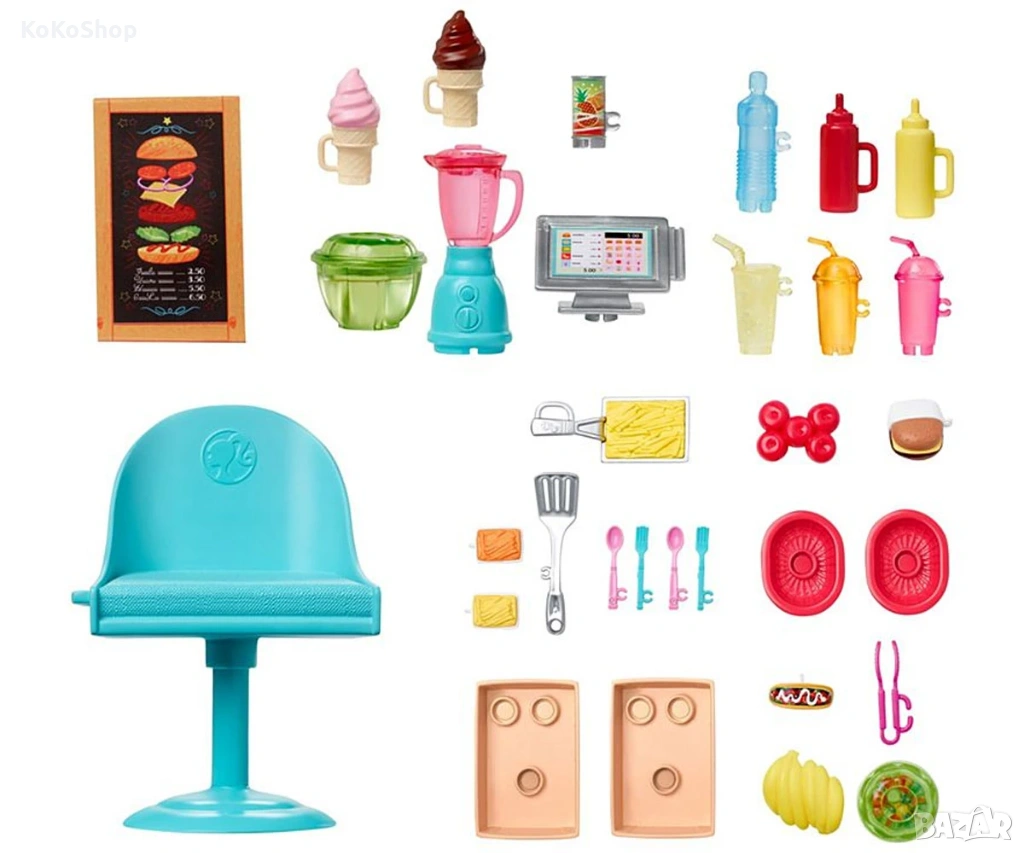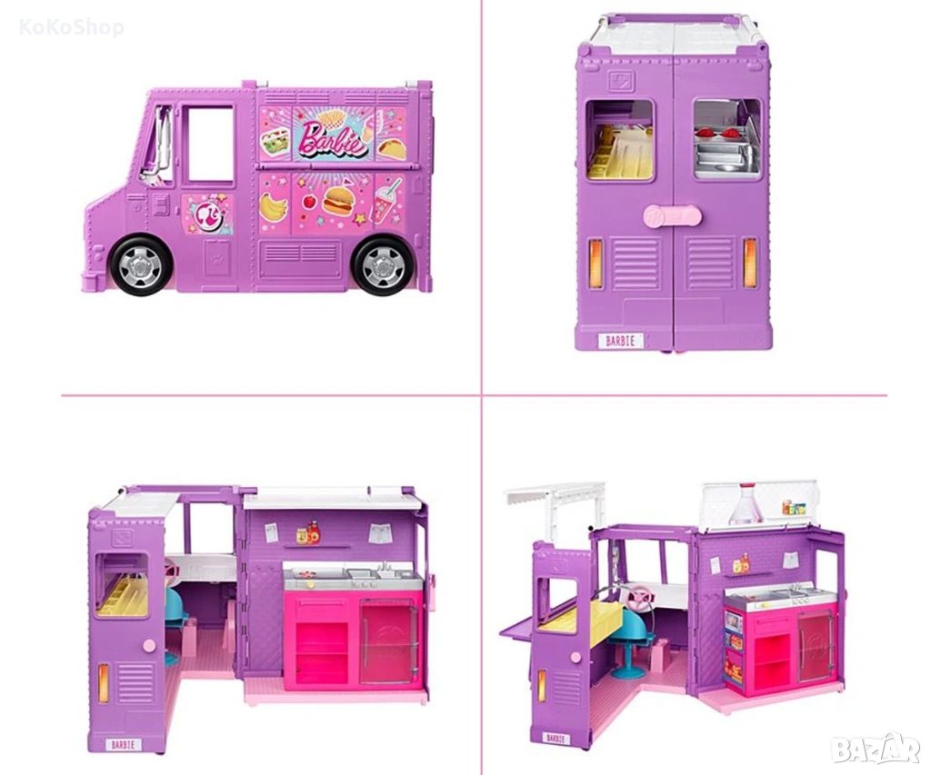 Барби, да приготвяш вкусна храна и да обслужваш клиенти, този игрален комплект е точно за теб! В камиона са обособени оборудвани зони за приготвяне и сервиране на храна с над 30 аксесоара: печка и скара, машина за смутита, фритюрник, блендер, барплот, шкафове, съдове, прибори и хранителни продукти.