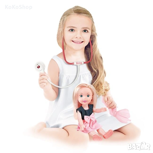 Красива кукла,облечена в прелестна рокля,в комплект с много медицински аксесоари (стетоскоп,термометър,очила,пинсета,очила,ножичка,различни флакони и др.),лекарска чанта и удобно легло.