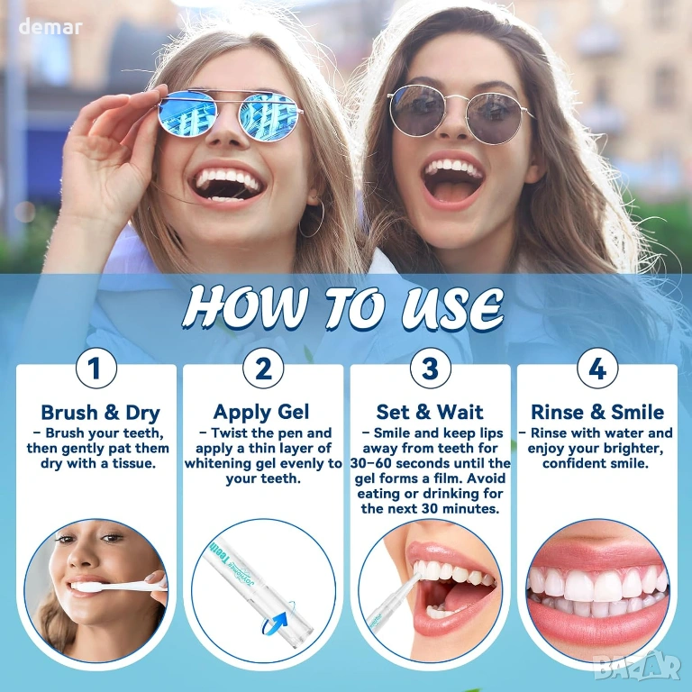писалка за избелване на зъби помага видимо да изсветлят зъбите си с до 4–8 нюанса само за седем дни, като нежно премахва петната, причинени от кафе, чай, вино, газирани напитки и ежедневни храни, без да уврежда емайла. Безопасна за емайла формула е проектирана да бъде удобна за чувствителни зъби и подходяща за ежедневна употреба, независимо дали у дома или в движение. Тънкият, удобен за пътуване дизайн на писалка с мек връх-четка позволява прецизно и безпроблемно нанасяне по всяко време. Простият триетапен процес се вписва лесно в натоварените рутини, а всяка писалка предлага над 30 приложения, като същевременно оставя освежаващ вкус на мента за по-чиста и по-уверена усмивка.