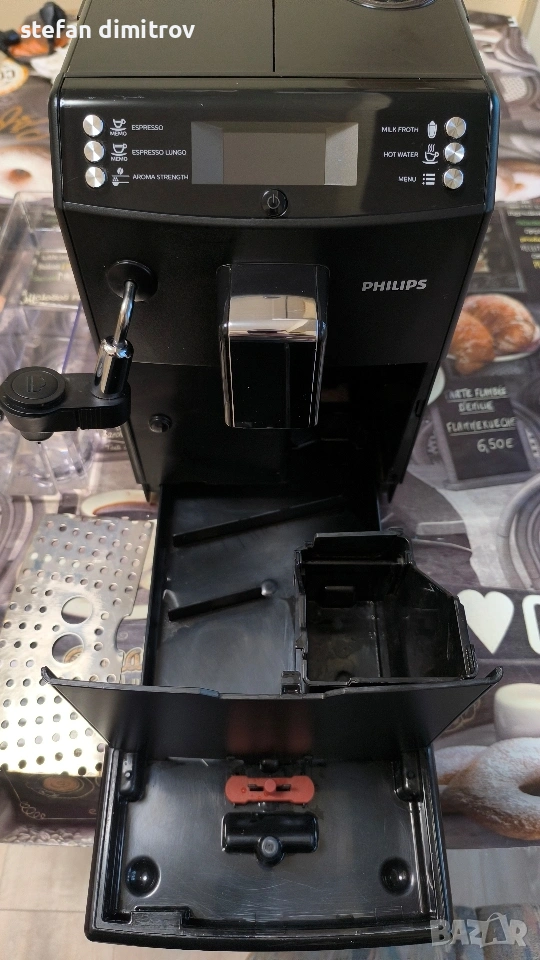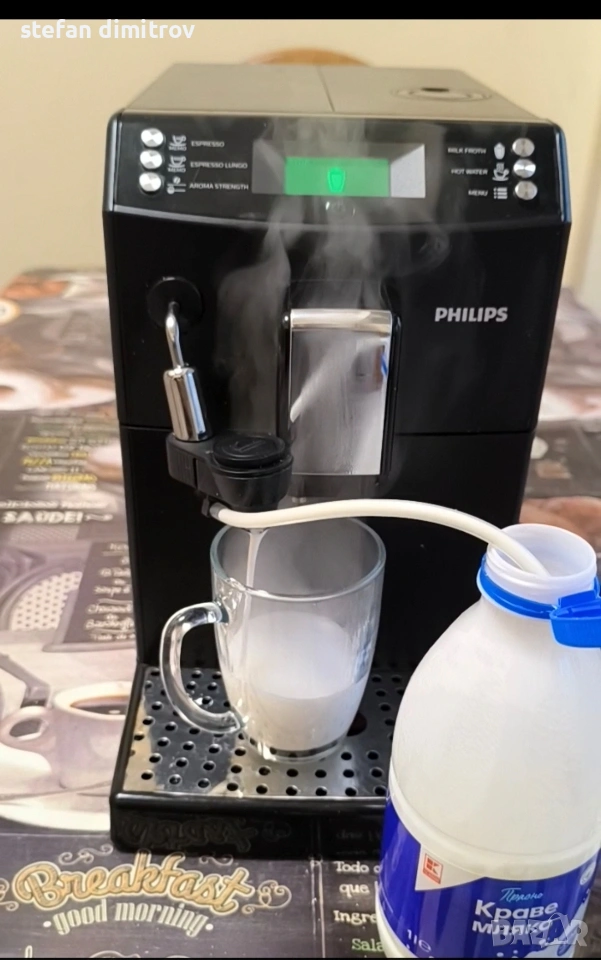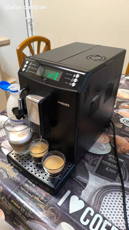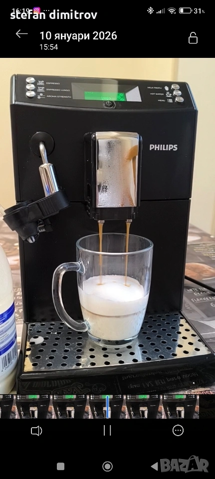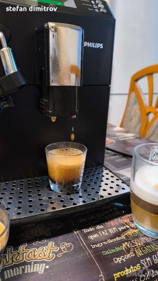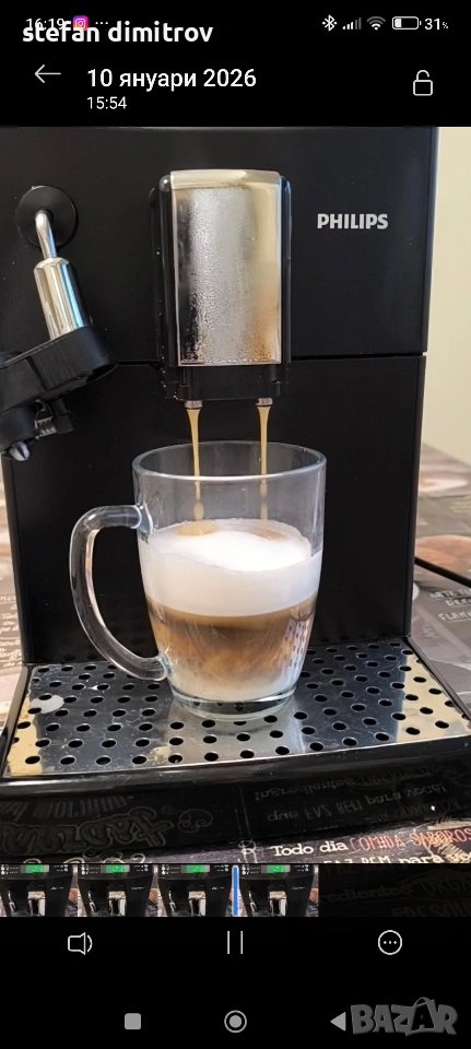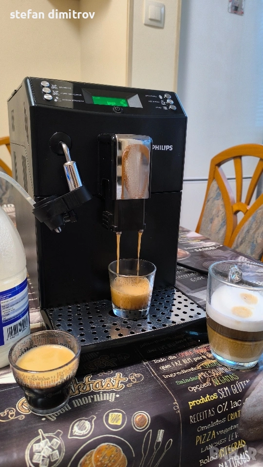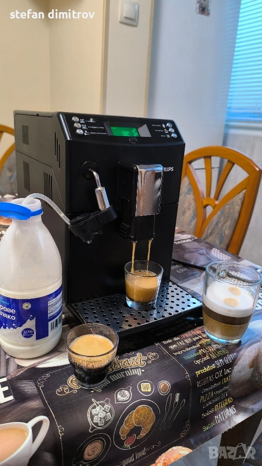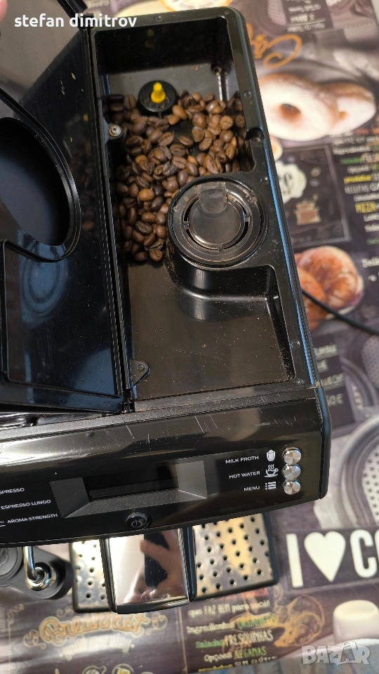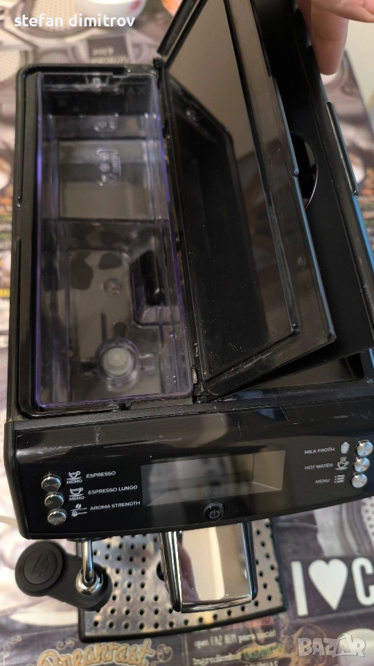 Кафе машината работи отлично единствените забележки са лисва оригиналната метална решетка на която се слагат чашите изрязана е по размер друга и е счупена дружката от едната страна на водния резервоар . Машината работи със кафе на зърна може и със смляно кафе . Вграден капочинатор за млечни напитки . Вграден накрайник и за гореща вода . Две програми със запаметяване дължината на кафето . 5 сатенени регулиране силата на кафето . ТипЕспресоМощност1850 WНалягане на помпата15 бараКапацитет на резервоара за вода1,8 лКапацитет на контейнера за използване на утайка от кафе+ лОбем на контейнера за кафе на зърна250 гФункцииКафемелачка, регулиране на силата на кафето, регулиране на порцията гореща водаМатериал на корпусаПластмасаИзползвано кафеВ зърна, смлениДисплей+ПодготовкаКапучино, ЕспресоПодвижен резервоар за вода+Подвижна тава за капки+Безшумна кафемелачкаС регулируема степен на смиланеПрограмаОтстраняване на котлен камъкЦвят на продукта [1]Цвят на продуктаЧерноРазмери на продукта [1]Ширина215 ммВисочина330 ммДълбочина429 ммТегло7,8 кг