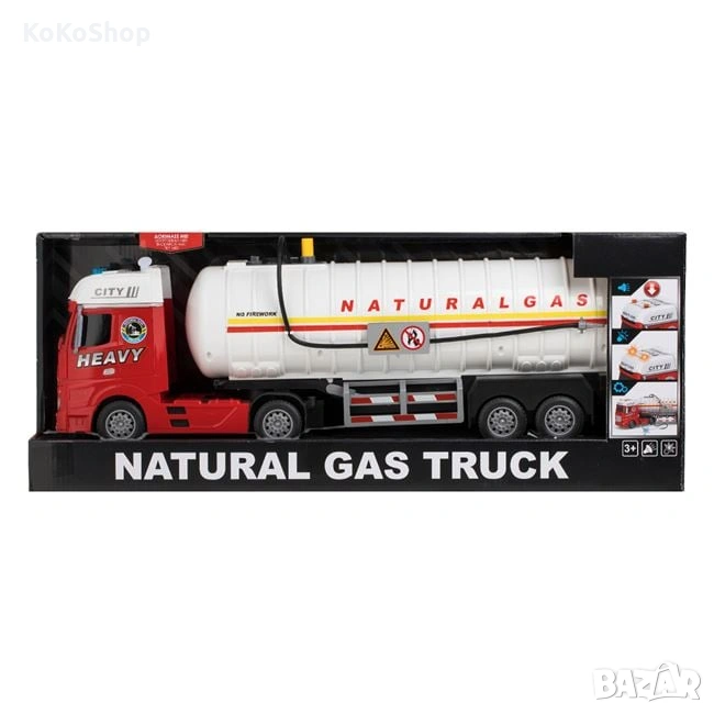 Детска цистерна с атрактивен дизайн и реалистични звуци. Задната врата на цистерната се отваря, а през люка в горната част можете да напълните резервоара с вода. С бутоните на покрива се включват светлините и работните звуци. Водата се разпръсква с помпа. Работи с 3 батерии AG13 (включени в комплекта).