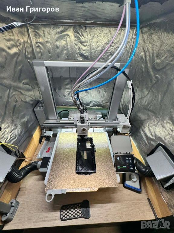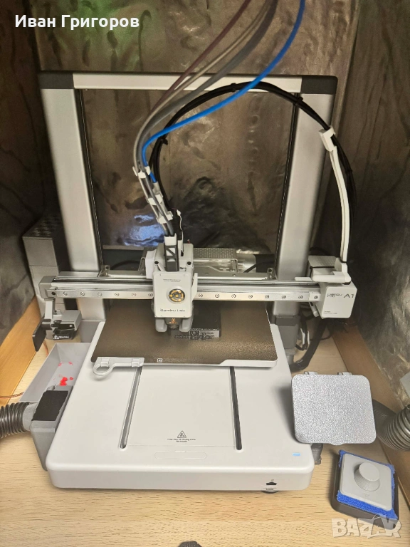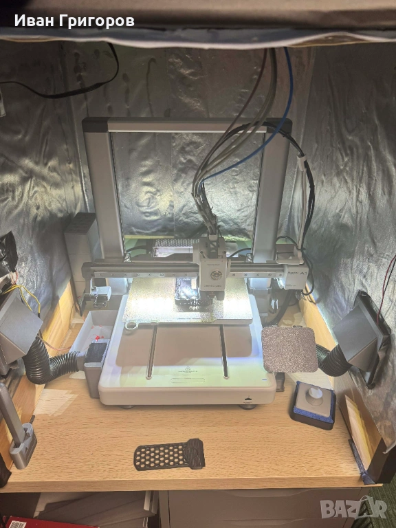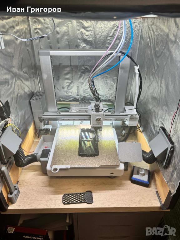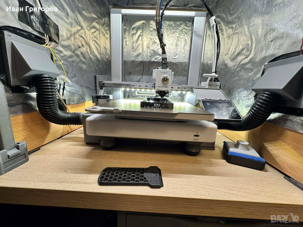 Продавам Bambu Lab A1 Combo с AMS Lite и BIQU Panda Breeze Cross Flow Fan – подобрено охлаждане за по-чисти детайли и стабилен печат, Panda Claw, всички hotend-и, няколко build plates