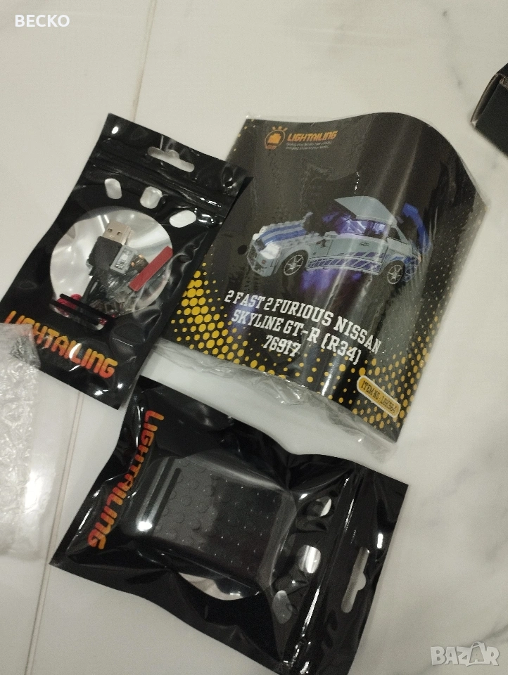Lightailing е марка, която произвежда специализирани LED комплекти, създадени да се вграждат в конкретни LEGO сетове. Те не са LEGO продукт, а аксесоар, който добавя реалистично осветление. Всеки комплект е модел-специфичен – т.е. пасва точно на даден LEGO сет. Горна кутия Lightailing LED Kit – Nissan Skyline GT-R (R34) Item No.: LGK564 Съвместим с LEGO сет: 2 Fast 2 Furious Nissan Skyline GT-R (R34) LEGO № 76917 Какво осветява: Предни фарове Задни стопове Подсветка отдолу (неонов ефект) Интериорни светлини (в зависимост от версията) Подходящ за: Колекционери Фенове на Fast & Furious Изложбени модели Може да осветите всякакъв LEGO автомобил ! Долна кутия Lightailing LED Kit – Gingerbread House Item No.: LGK245 Съвместим с LEGO сет: Gingerbread House LEGO № 10267 Какво осветява: Вътрешно осветление на къщата Прозорци Коледни декоративни елементи Топла, празнична светлина Подходящ за: Коледна декорация Зимен LEGO дисплей Домашна витрина Какво съдържа всеки комплект: LED светлини (микро LED, различни цветове) Батерийна кутия (обикновено за AA или AAA батерии) Кабели и конектори Инструкция за монтаж Монтаж и употреба LEGO моделът не е включен Монтира се след като LEGO моделът е сглобен Не се реже и не се лепи – кабелите са тънки и минават между тухличките Цената е за бр.