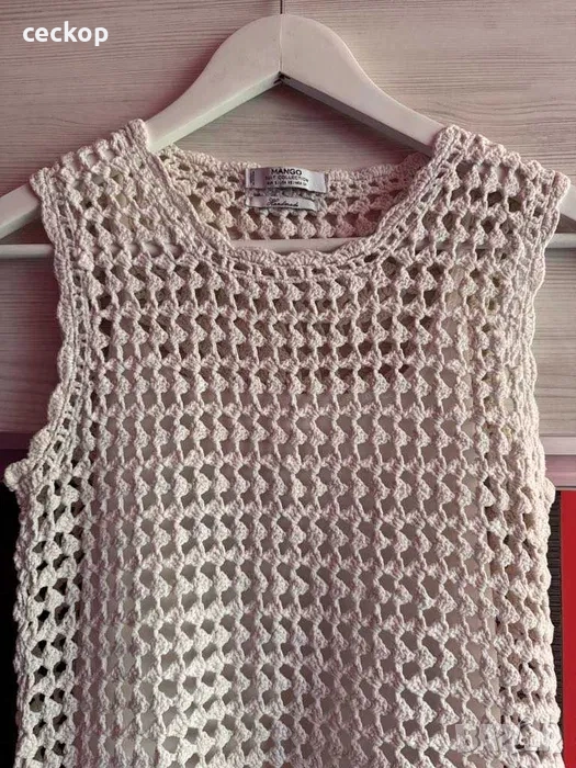 Уникална рокля Mango, в отлично състояние. Памучна материя, ръчно изработена, подходяща и за плаж. Роклята е умалена и отговаря на Размер: 34 (XS)