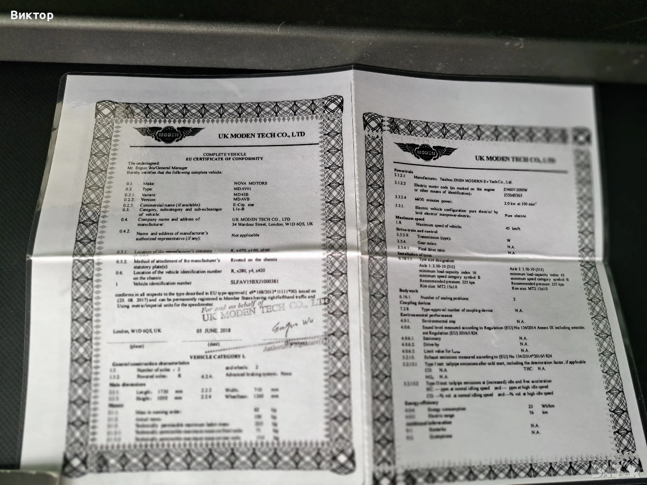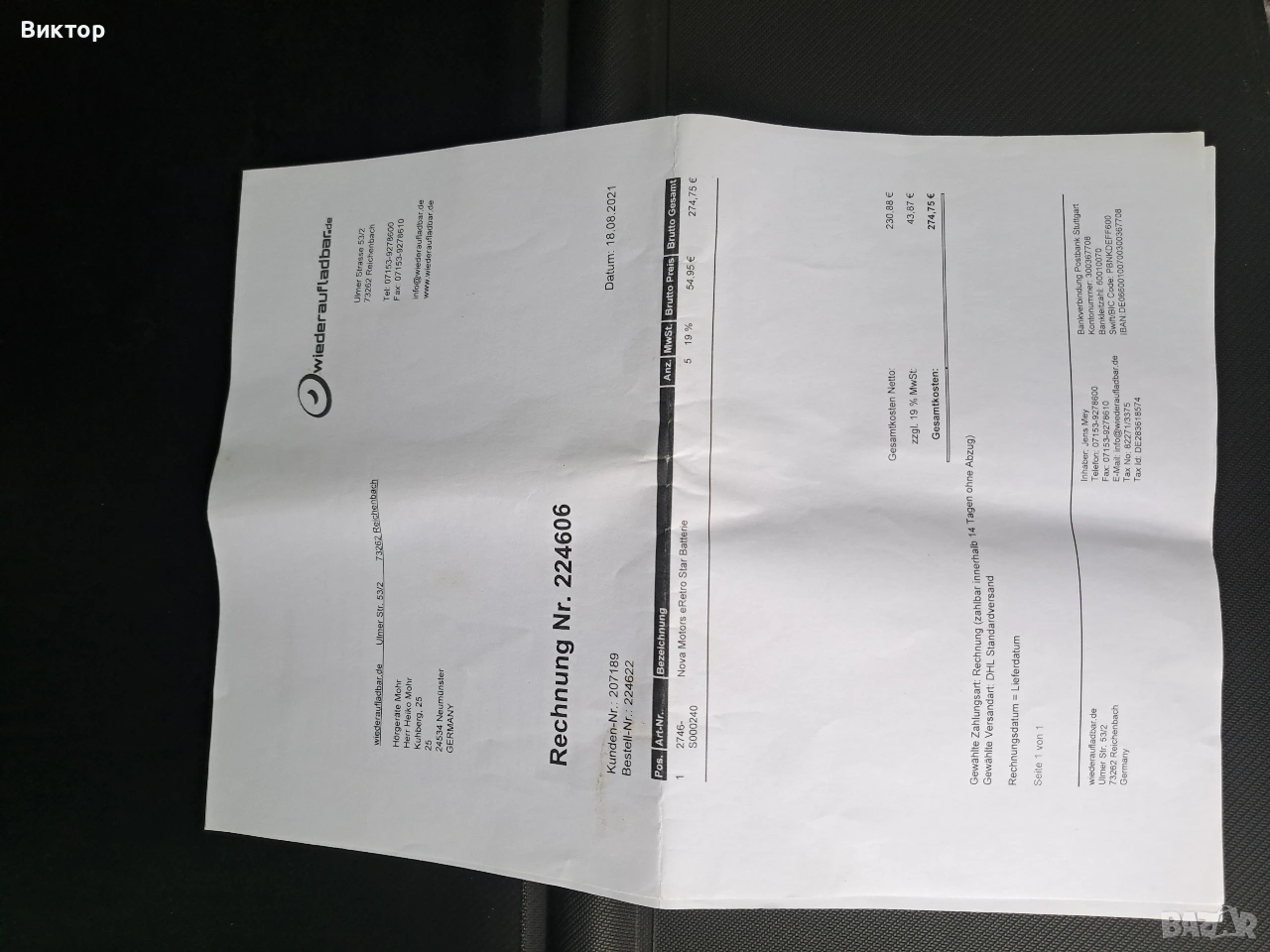 Батерията е подменена през 2021 г., има фактура за смяната. Характеристики: Максимална скорост: 45 км/ч Пробег: 12 735 км Батерия: 60V (оловна) Реален пробег с едно зареждане: около 30–40 км Зарядно в комплект Топ каса отзад Имобилайзер / дистанционно 2 ключа 📄 Документи: ✔ EU Certificate of Conformity (COC) ✔ Фактура ✔ Serviceheft + инструкции ✔ VIN номер ✔ Предишна застраховка (Германия) ➡️ Пълен комплект документи – легален за ЕС 🛣 Подходящ за: Градско каране Кратки извънградски разстояния Ежедневно придвижване до работа или магазин ⚠️ Не е предназначен за магистрала. ℹ️ Състояние: Скутерът се кара всеки ден, всичко работи нормално. Има нормални следи от употреба според годините. 💰 Цена: 1 466,88 Възможен разумен коментар на място.