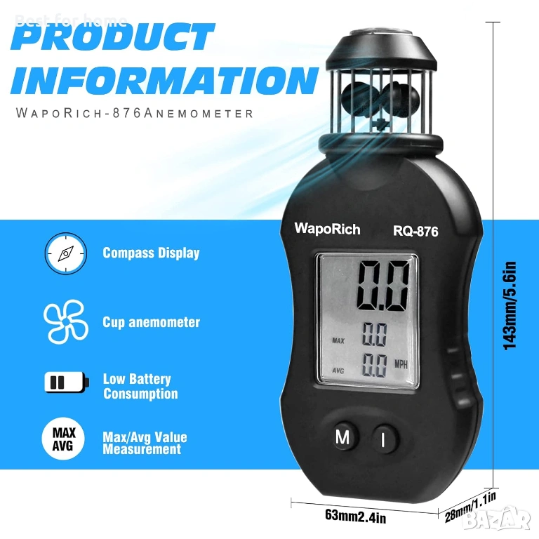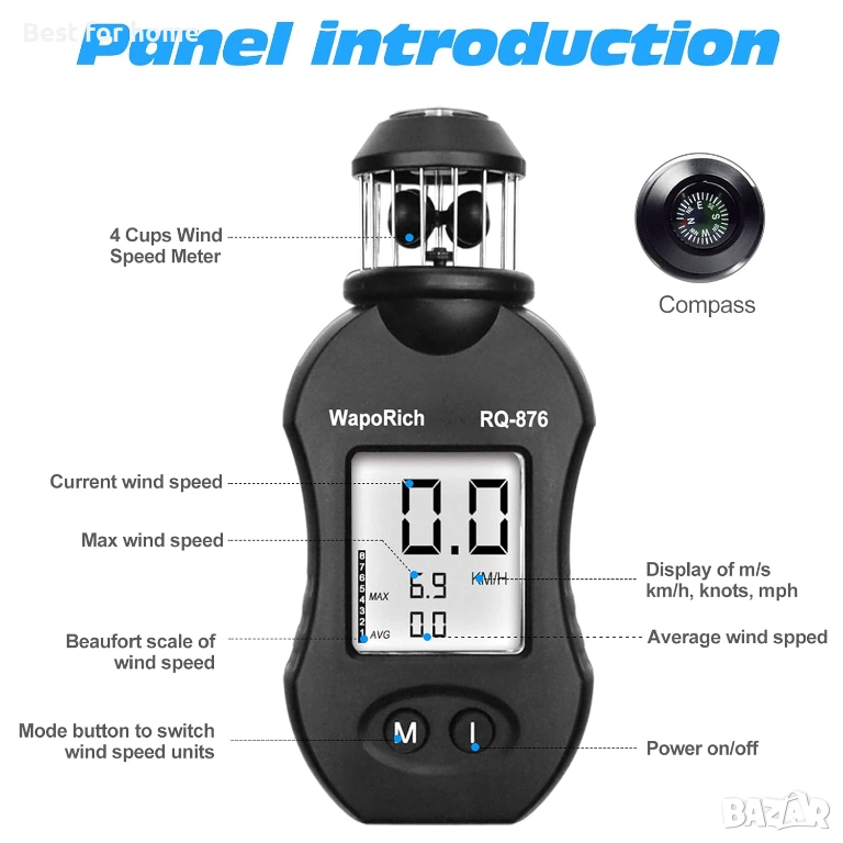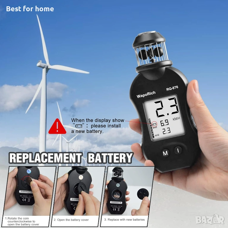 【Лесен за употреба】 Показване на мерна единица за скорост на вятъра: км/ч, възли, м/с, мили/ч. Показване на силата на вятъра: максимална/средна. Включена е батерия CR2032 (не е необходима отвертка).